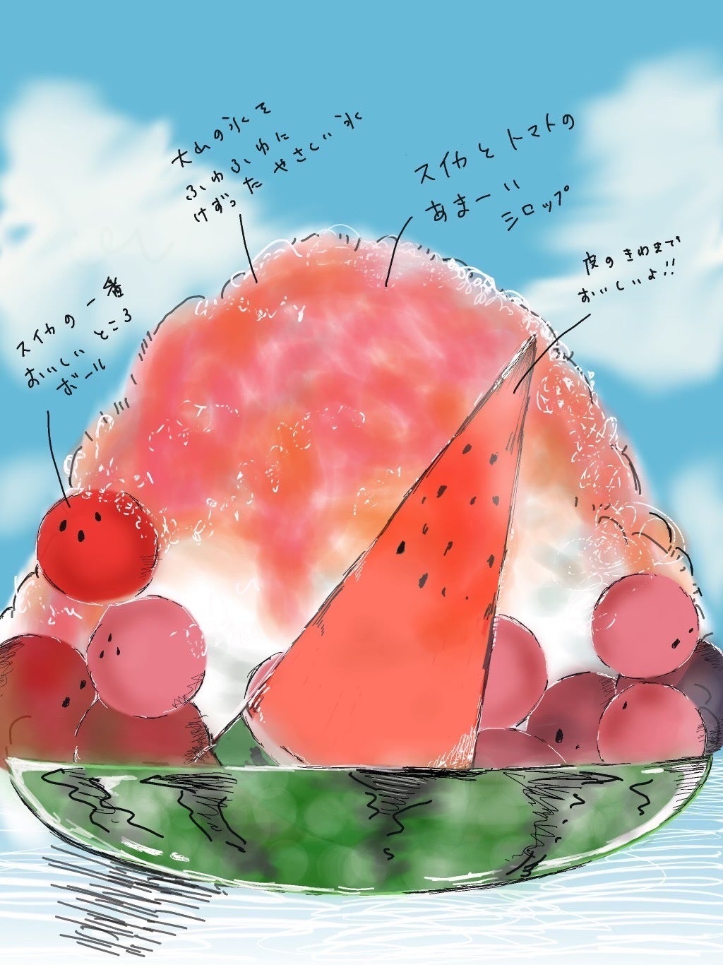 池口農園はスイカ農家です。スイカには自身があります!!昨年は優秀生産者として表彰をしていただき、品質・生産量共に優秀と認めていただきました。そんなスイカを使ったメニューとして、スイカのかき氷を考えています。イラストはイメージですが、生産者だからできるボーリュームで提供できるよう構想中です。