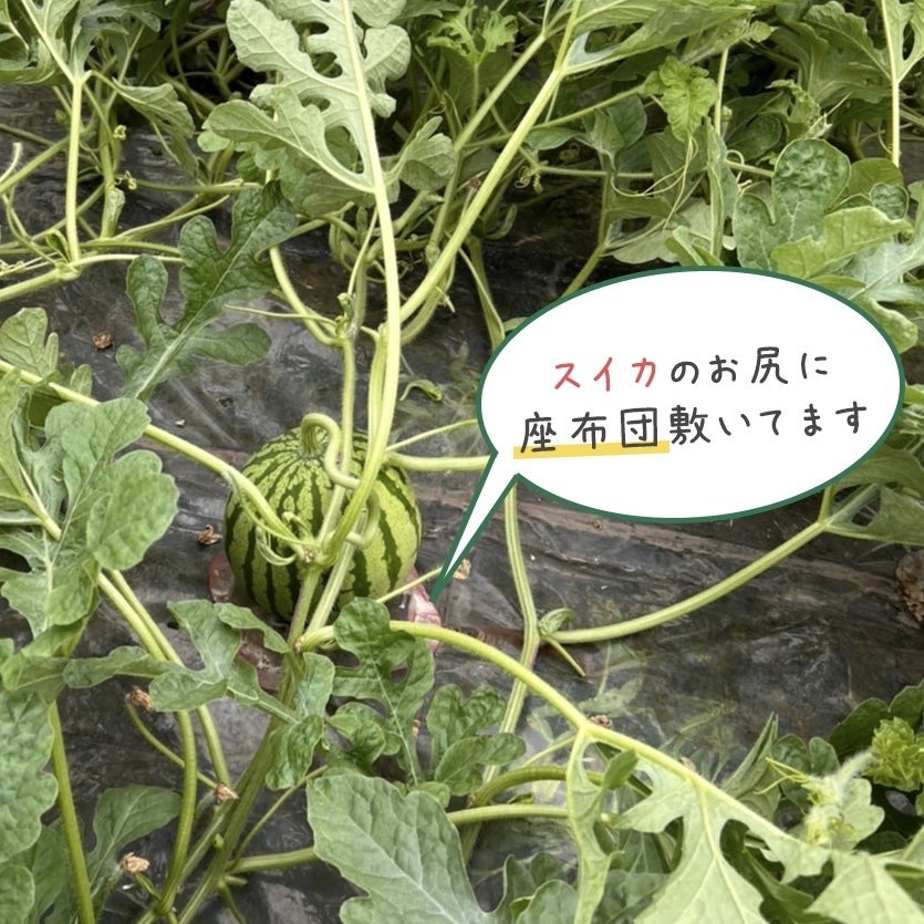スイカが赤ちゃんの頭ぐらいに膨らんできたら満遍なく光を当てて色むらをなくすために皿しき作業をします。スイカのお尻に座布団を敷いてちょこんと座らせるイメージです。この時スイカと繋がっているツルが千切れやすいので要注意…今までの苦労が水の泡になります。敷き終わった後はスイカが綺麗にお行儀良く並んでいてとってもかわいいです!スイカたちはこのまま収穫までお皿に座ってスクスク大きくなります。
