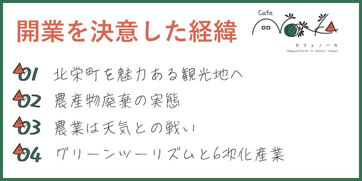 私たちは鳥取県北栄町で特産品である『大栄スイカ』を中心にスイートコーン・ブロッコリー・小松菜・ほうれん草・ストックを生産する専業農家です。「どうしてcafeなんだ?」「どうして農業だけではダメなのか?」私がこのプロジェクトを立ち上げるに至った思いを最後まで見ていただけると嬉しいです。
