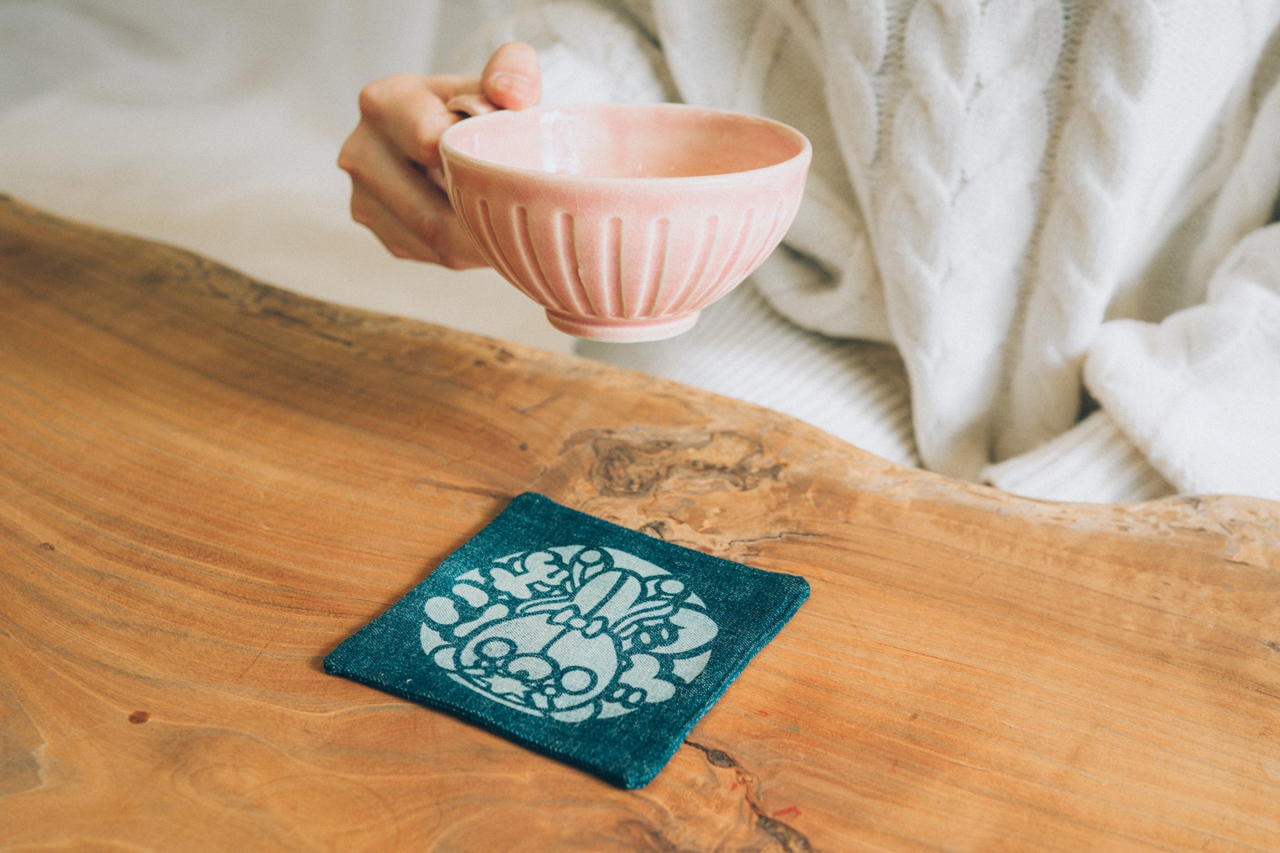 型紙の図案から制作しデニム生地を染めています。こちらもコースターと同様、型状にデニム生地の藍色を抜き繊細な柄を表現しています。デニム生地の種類によって柄の出方や風合いが異なりますので、お届けまで楽しみにお待ちください。