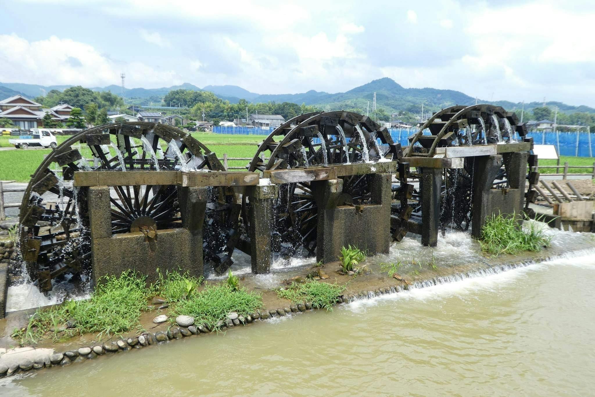 福岡県朝倉市は、水や緑、空気といった豊かな自然環境に恵まれています。 市南部には、境界にほぼ沿う形で、九州一の大河である筑後川が流れています。ここから派生する形で、筑後川の洪水を治め、安定的に高田へ農業用水を供給するために築かれた堀川の三連水車群があります。この三連水車は、現在も毎年6月中旬から10 月中旬まで稼働してます。