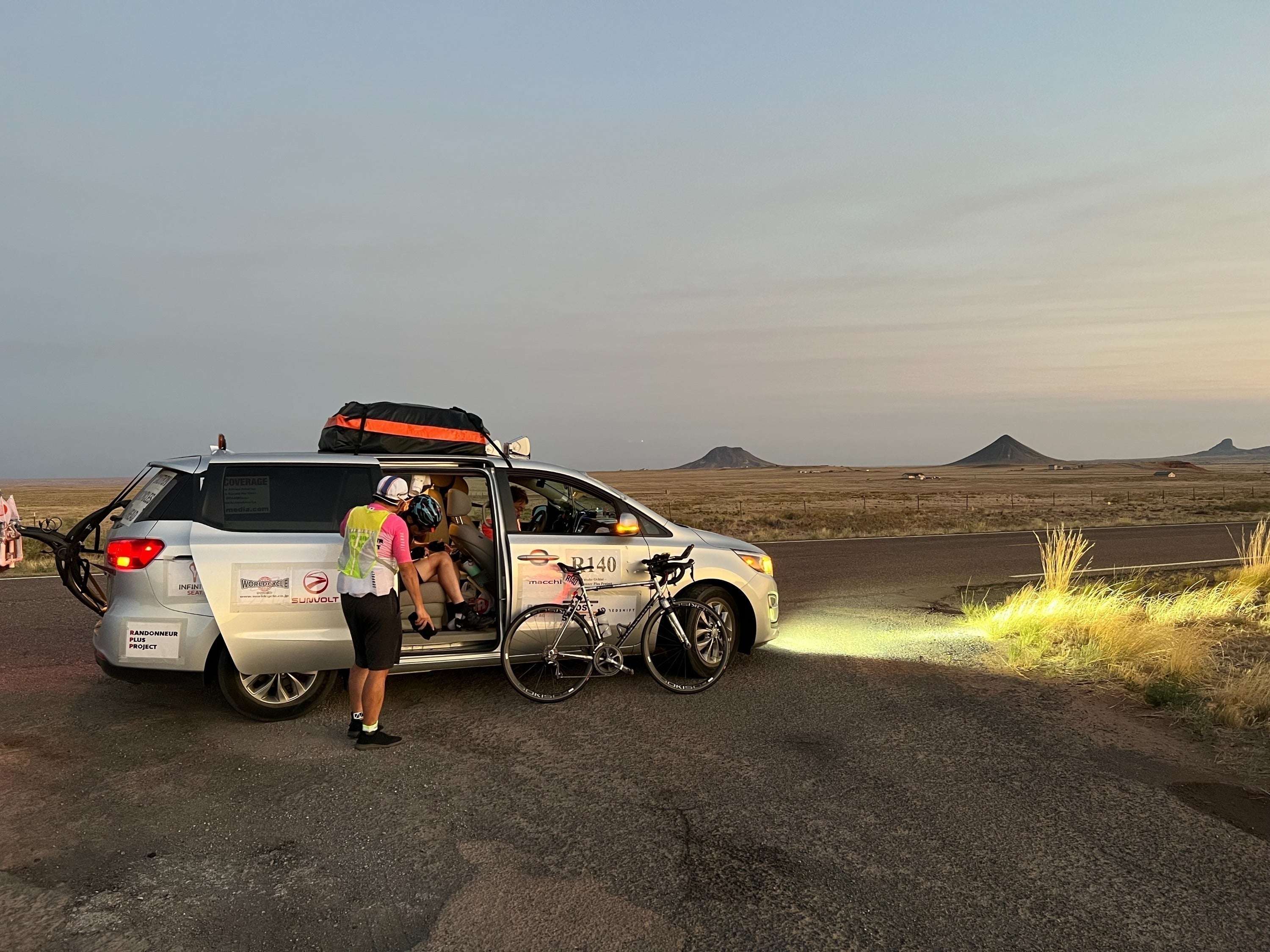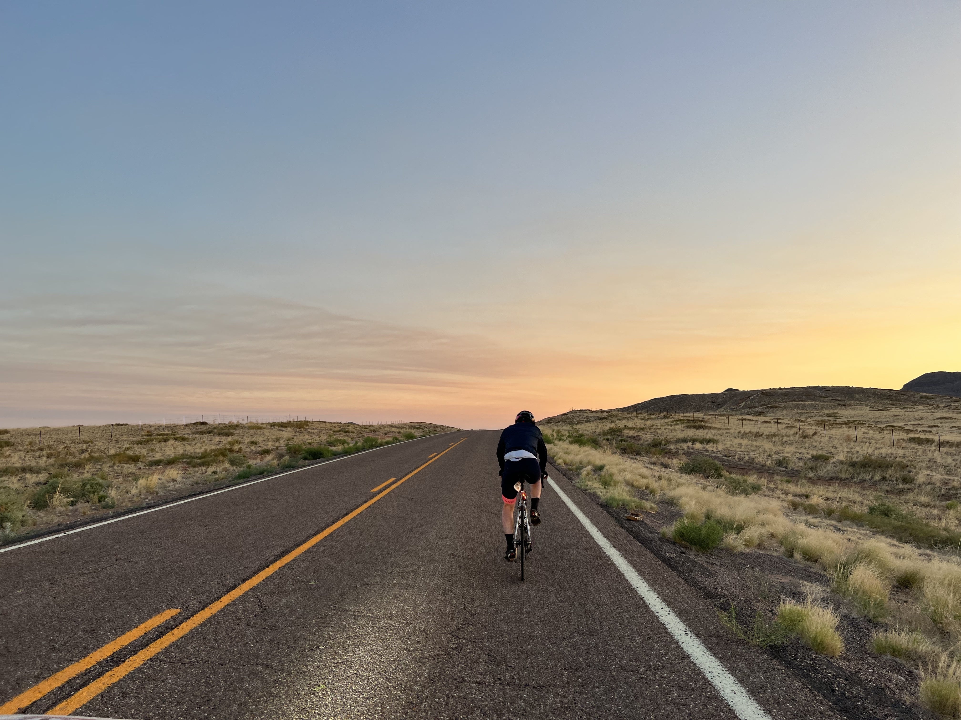 カリフォルニア州オーシャンサイドからコロラド州デュランゴまでの約1,500kmを走った。朝焼けのなか、地平線まで続く道をゆく