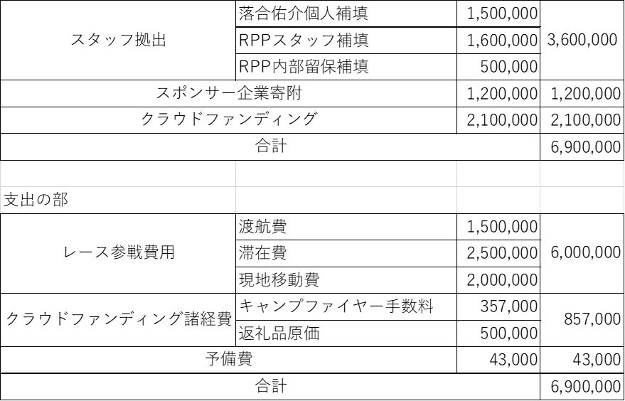 10名を越えるスタッフにて10日間にわたって落合佑介のレースをサポートしていることから、現地での宿泊費を含む滞在費として250万円を予定しております。