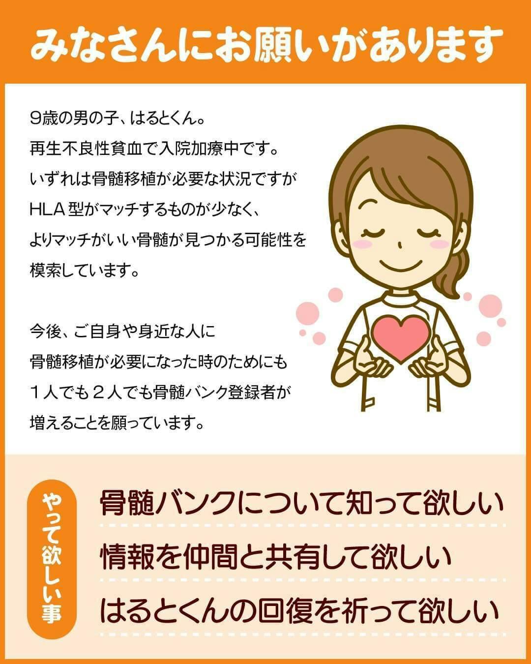今日はみなさんにお願いがあります。再生不良性貧血を患う9歳の男の子、はるとくんのお話です。