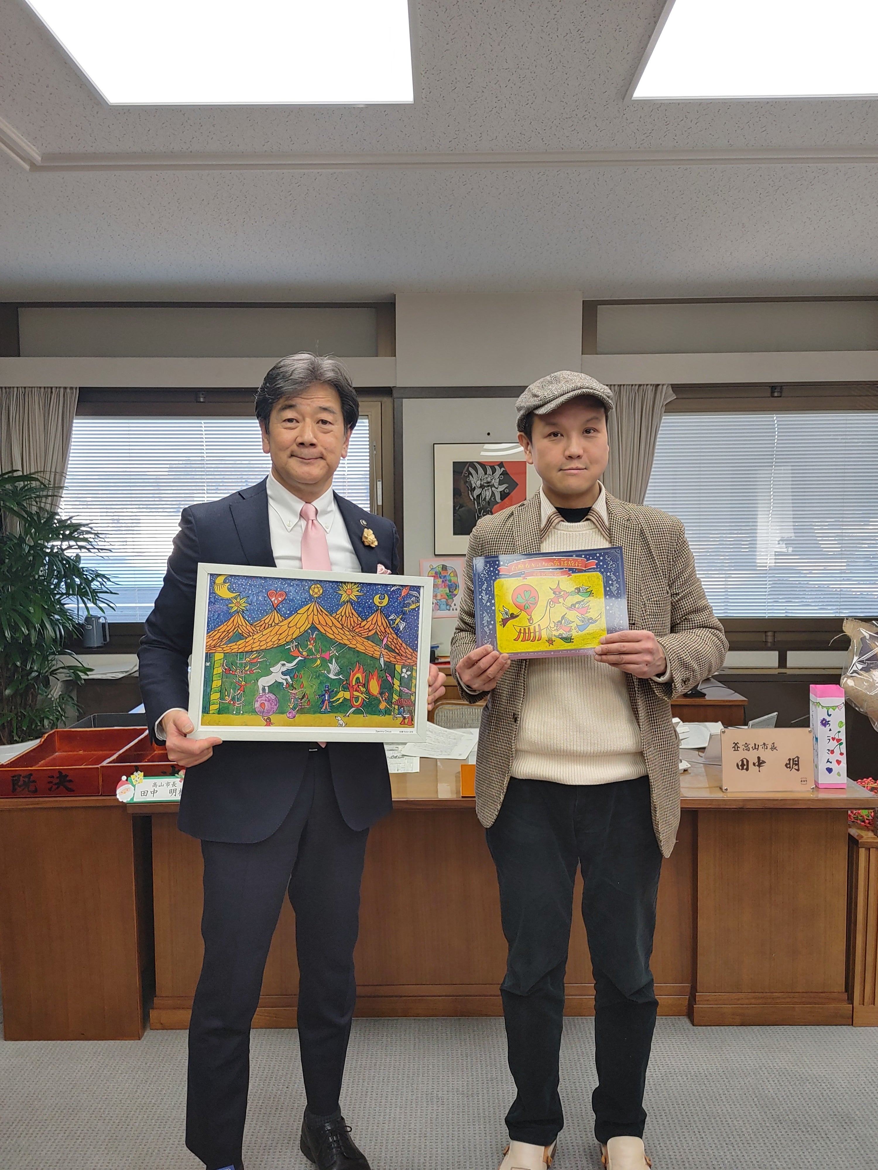 田中市長は、公務のお忙しい中、咋年末の絵本原画展にも、ご来場くださり、絵本に至るまでの経緯も、知っていただいていたのでスムーズに会話が進みました。