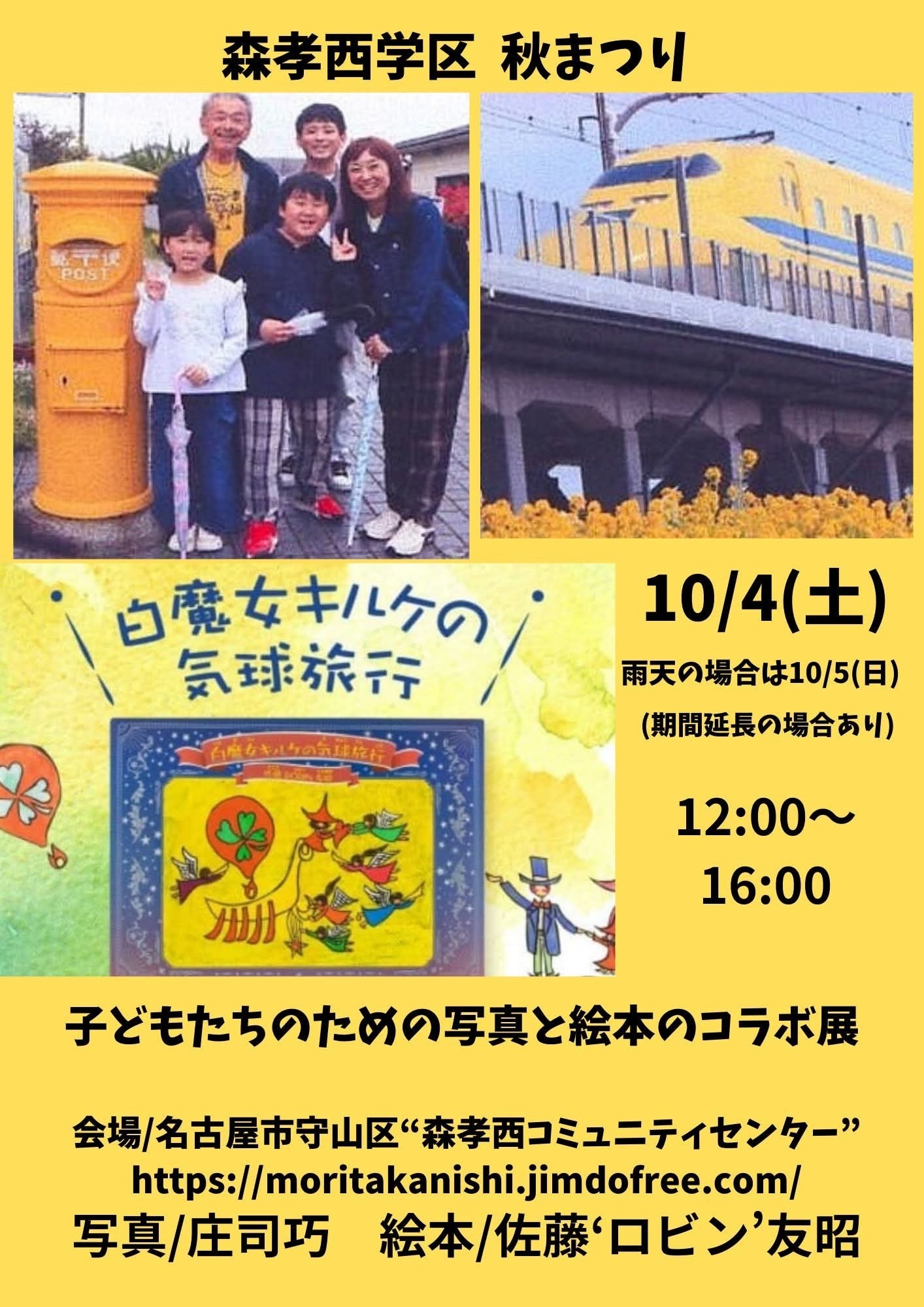 明日の名古屋は雨のようで、5日に順延となりました。タイムテーブルは、そのまま移行となります~よろしくお願いいたします(^-^)------------------------------------------------------------------------10月4日(雨天時は5日)名古屋市守山区 森考西コミュニティーセンターにて、長きに渡りシンガーソングライターとして活動している福井大輔さんに、お声がけいただいて名古屋で発のコラボレーションです。写真家で、小児がんの子供さんの好きなドクターイエローの写真を撮り続け、丸型ポストの美化活動や、写真が、切手に採用されていたり、多岐に渡って活動されてる庄司巧さんと、「子供達の為の写真と絵本のコラボ展」です(^-^)秋祭りの一環で写真の展示と、絵本とポスターの販売です~今から楽しみですが、超方向音痴なので一時間半は、早目に出発したいと思います(^-^)v#絵本 #白魔女キルケの気球旅行 #応援金 #募金活動 #心臓病の子供を守る #YouTube #家具制作 #ふるさと納税返礼品 #クラフト #アクリル画 #ブルース #フィンガースタイル奏法 #路上ライブ #カントリーブルース #CD発売 #blues #心房細動 #心房粗動 #房室結節リエントリー性頻拍