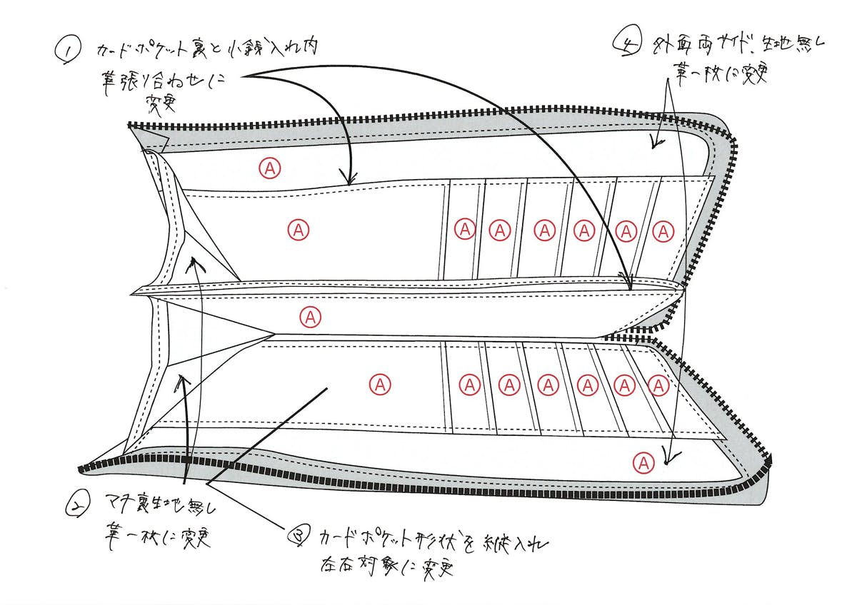 Aはすべて革です。又4番のオープンポケットの所では革1枚に変更とありますが、革だけですと長くお使いになるのに形もくづれてしまいますので革と生地のコンビに仕上げてあります。したがいまして、革のウラ側が出ている所はまったく有りません。