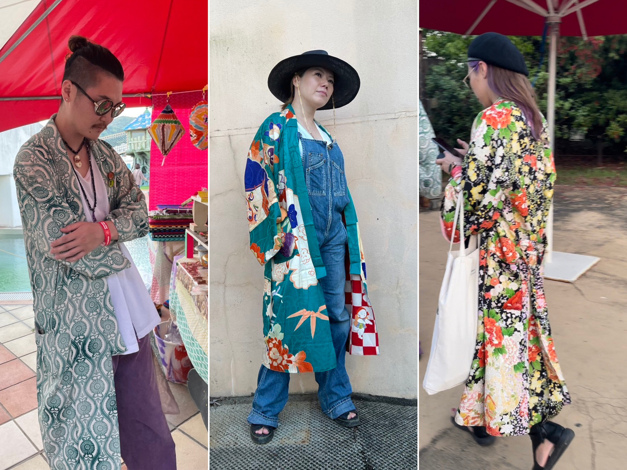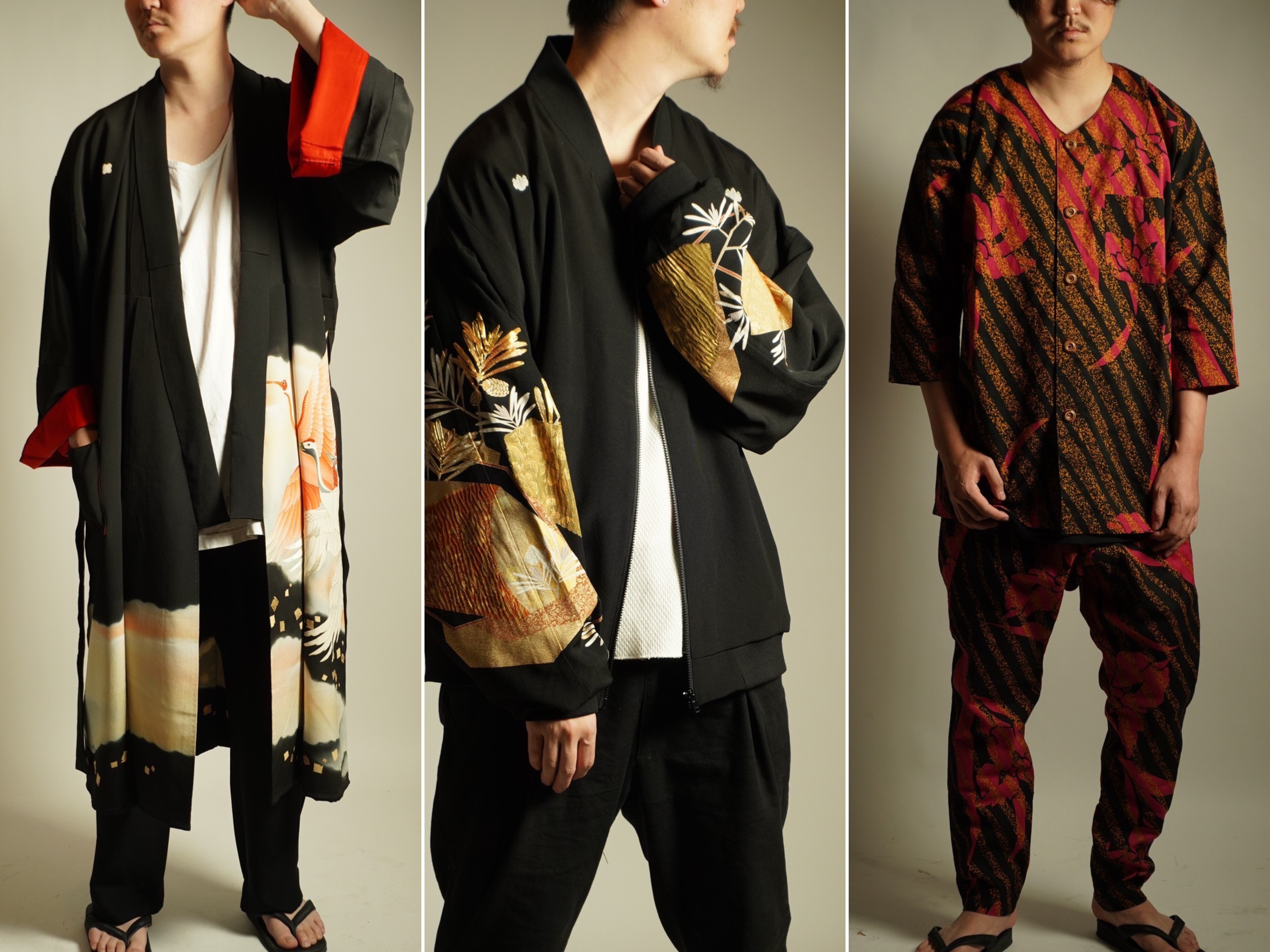 (左)着物ガウン、(中央)ブルゾン、(右)鯉口セットアップ