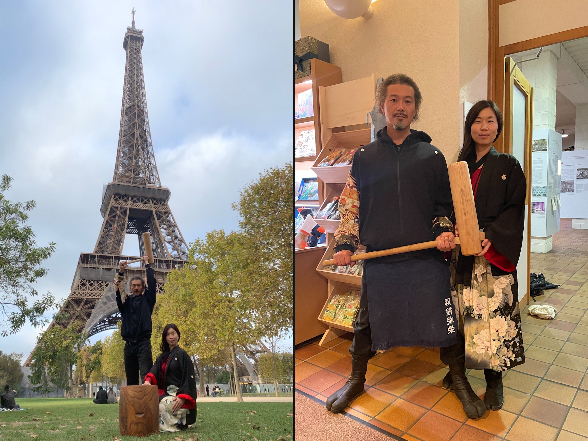 フランスのアルザスで開催される「北斎展」のオープニングイベントで餅つきを披露することになった、「祝餅 弥栄(いわいもち いやさか)」のゆうきさんとさきさんの作業着をデザインさせていただいたのです。