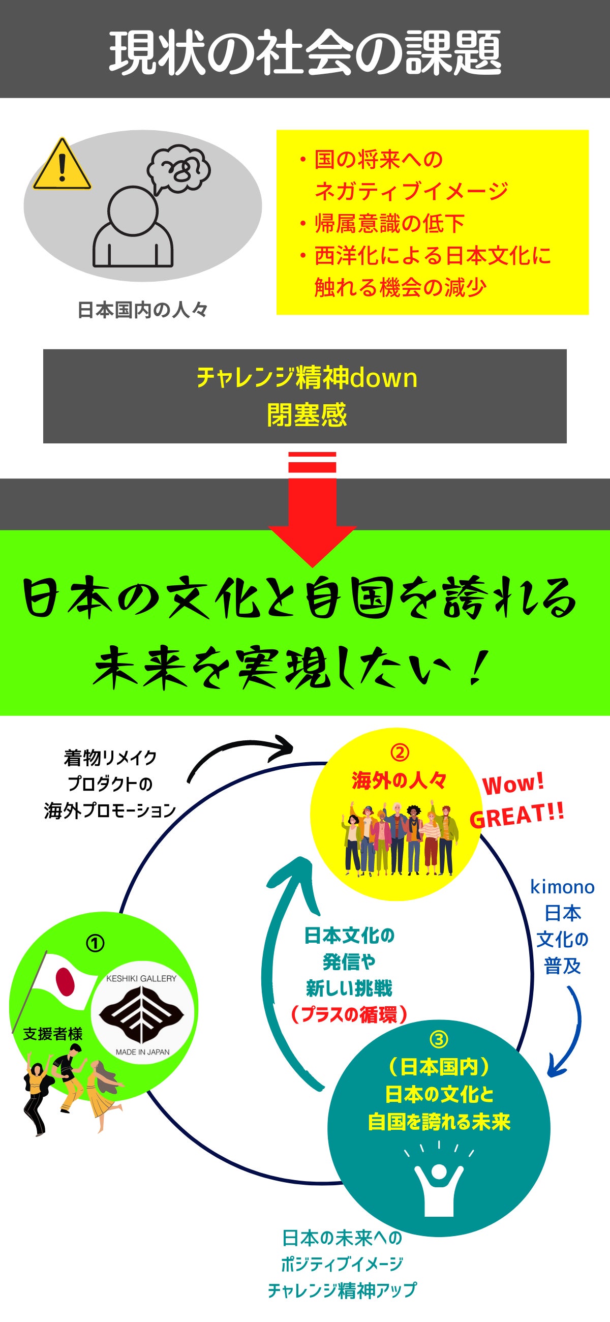 着物リメイクブランドの活動を通じ、海外の人たちに着物や日本文化の素晴らしさを伝えることで、「日本文化や日本人であることを誇れる未来」を実現していきたいと思い、当プロジェクトを立ち上げさせていただきました!