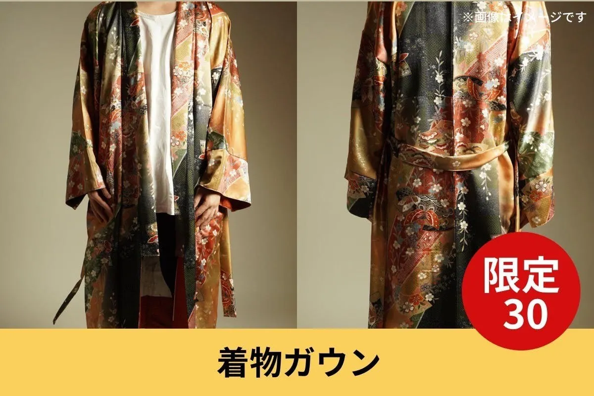 ヴィンテージの着物を新しく生まれ変わらせ日常に落とし込む、サステナブルなプロジェクトです。 色柄が1点物となりますのでデザインはお任せください。 1点物のヴィンテージの着物を羽織りやすいガウンに仕立てました。 ユニセックスで使えるように腰紐のベルトループは2パターンの高さを選べる仕様にしています。