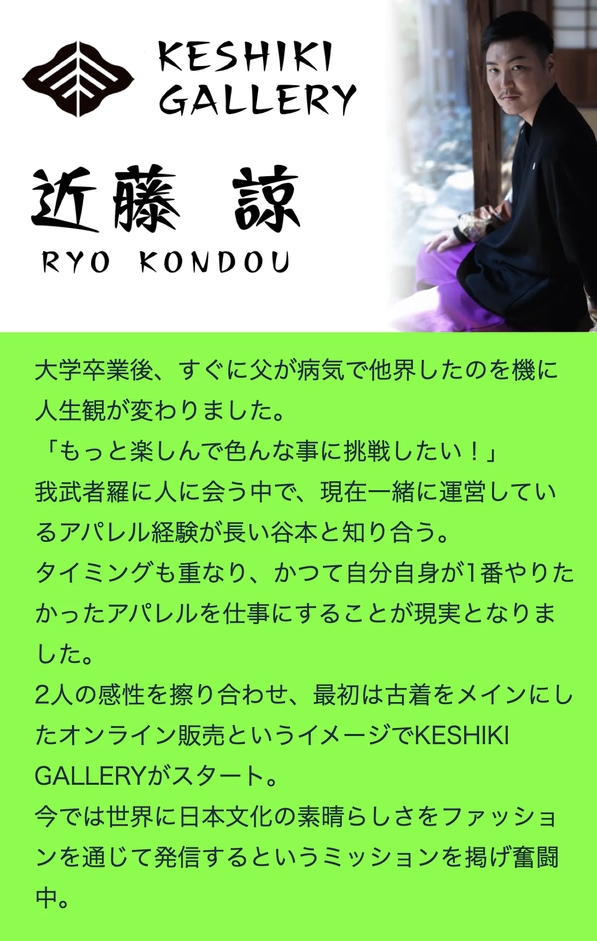 はじめまして。着物リメイクブランド KESHIKI GALLERY の近藤と申します。数あるプロジェクトの中からご覧いただきありがとうございます。