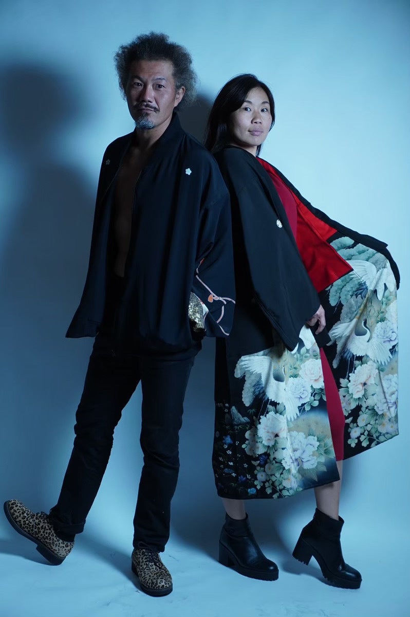 アンティークの着物を使用しているので、さきちゃんが着ているガウンは裏地が赤くて、鶴の柄が日本らしさと高級感を漂わせています。