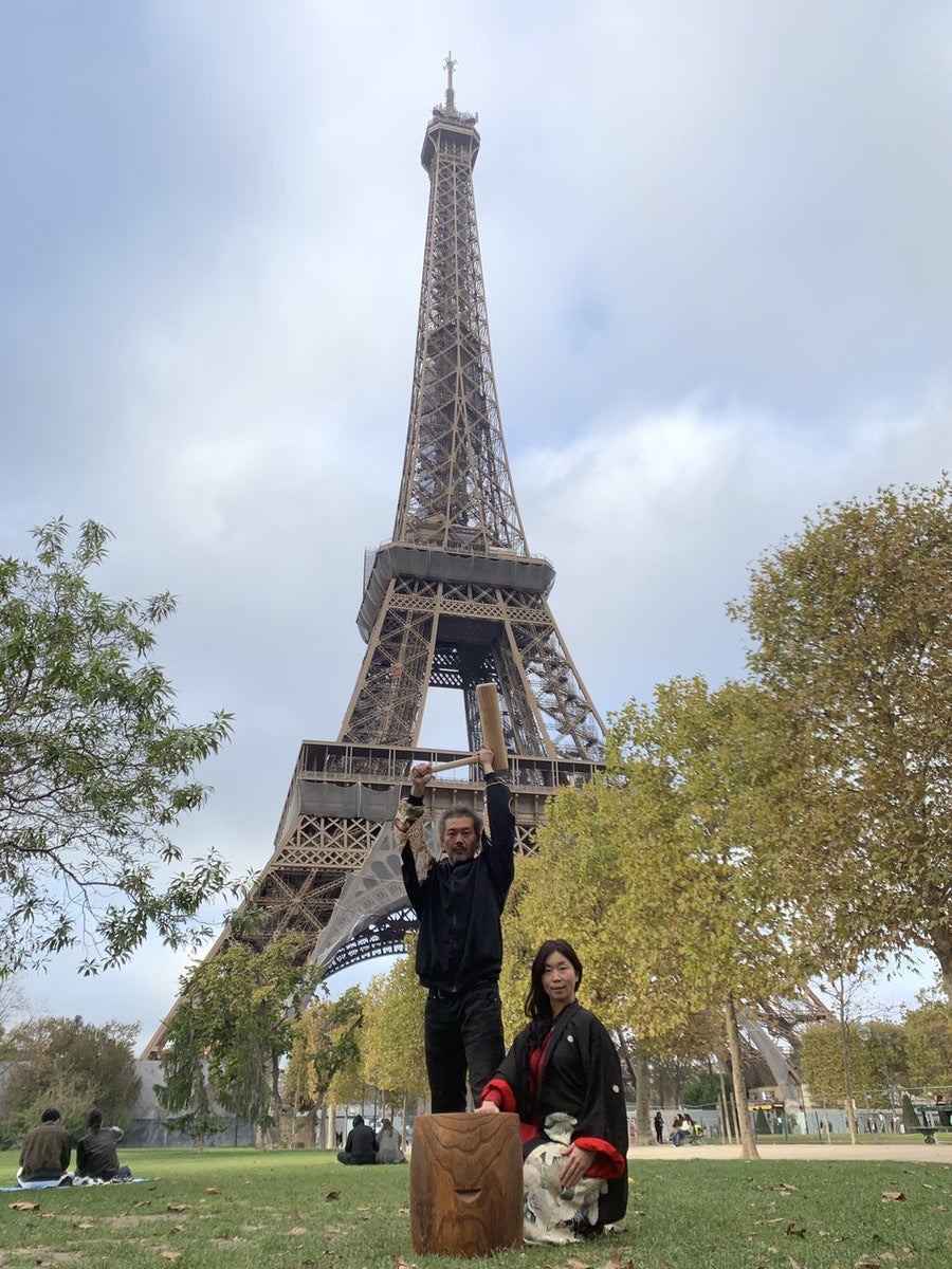↓↓エッフェル塔の下で杵と臼を持って、着物リメイクに身を包み写真を送って下さいました。