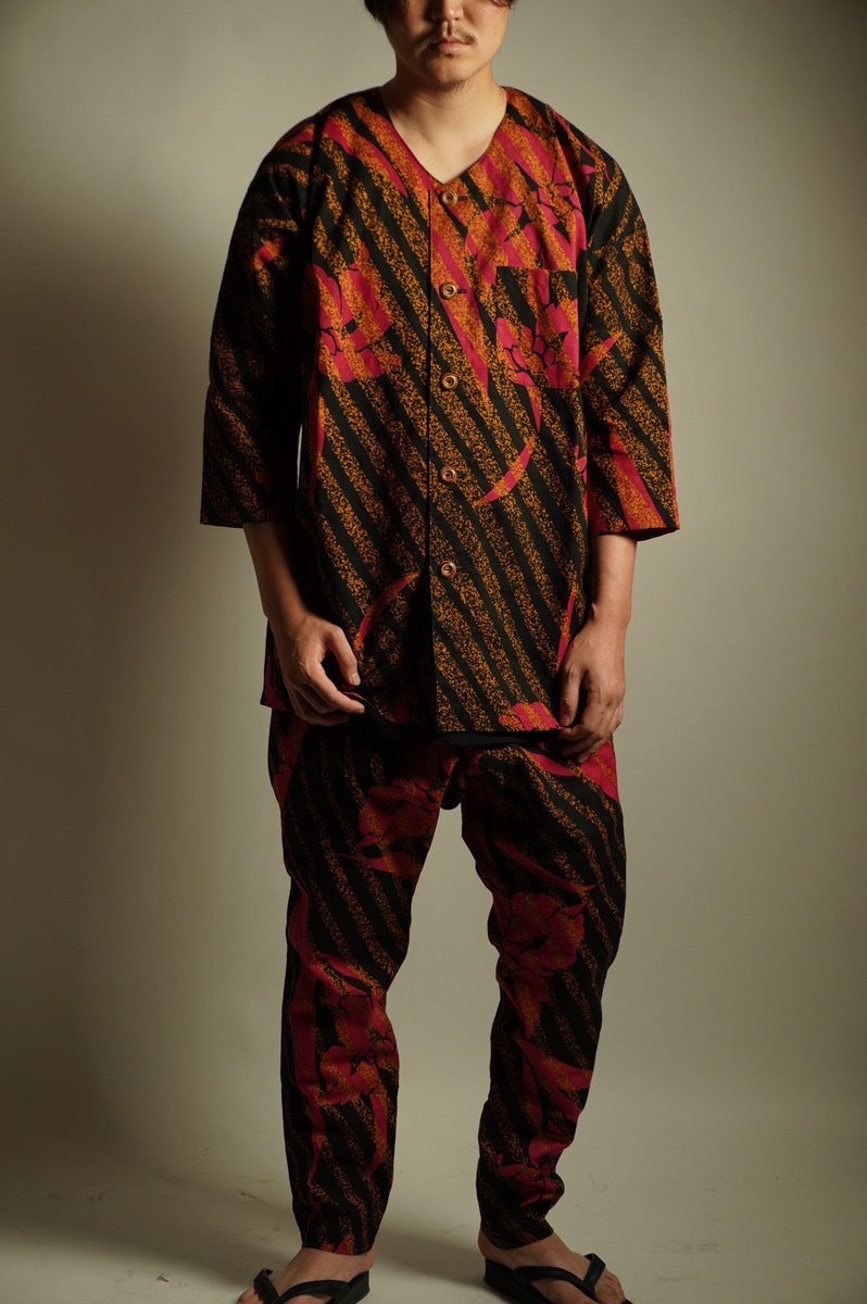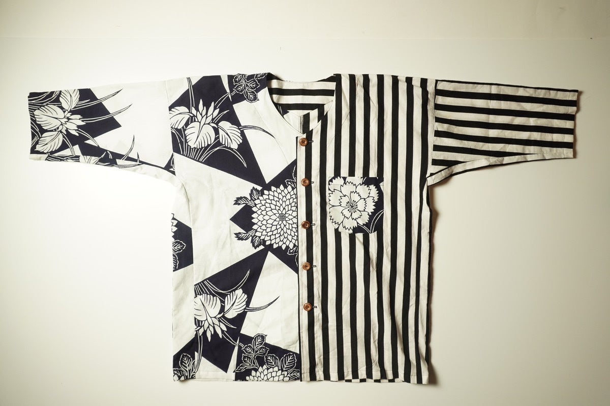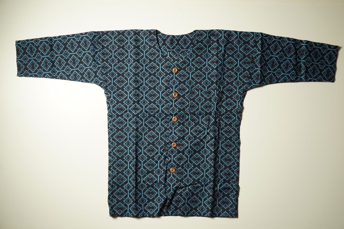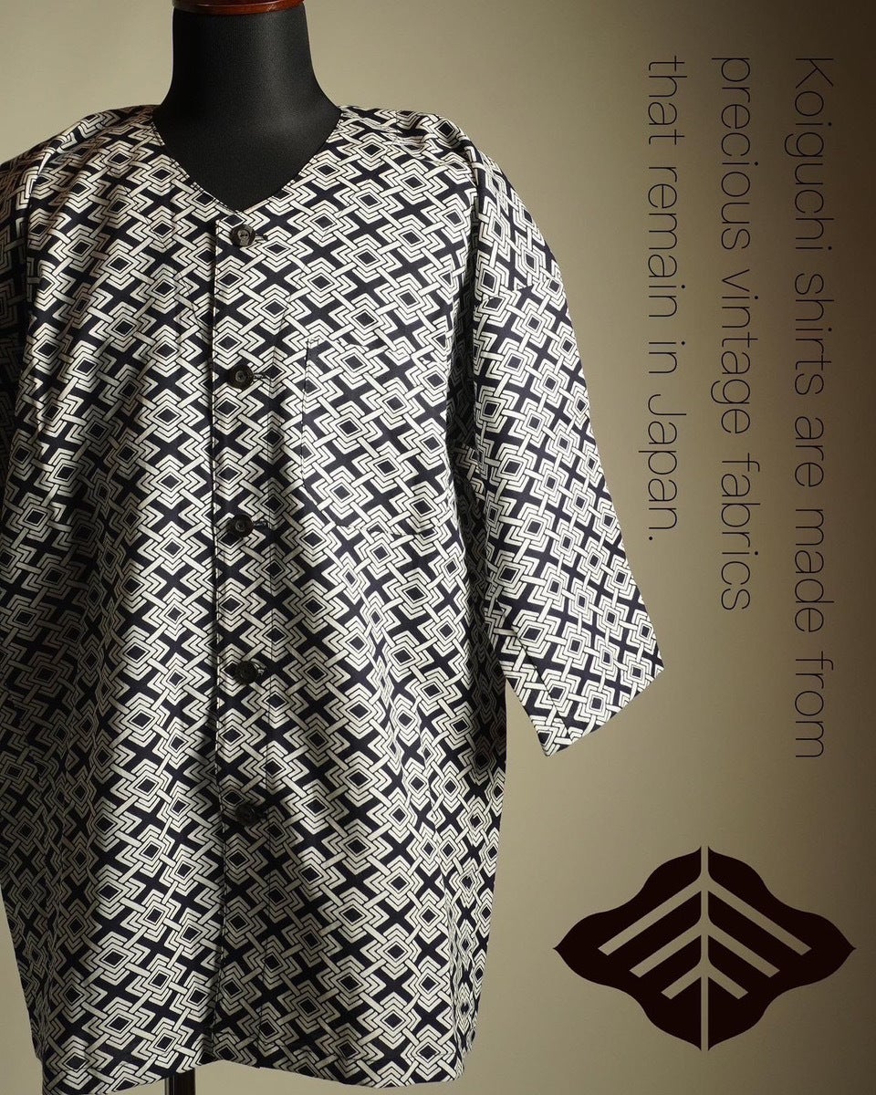 ↑ベースの色が黒っぽい反物から制作した鯉口シャツ。渋い雰囲気が漂います。