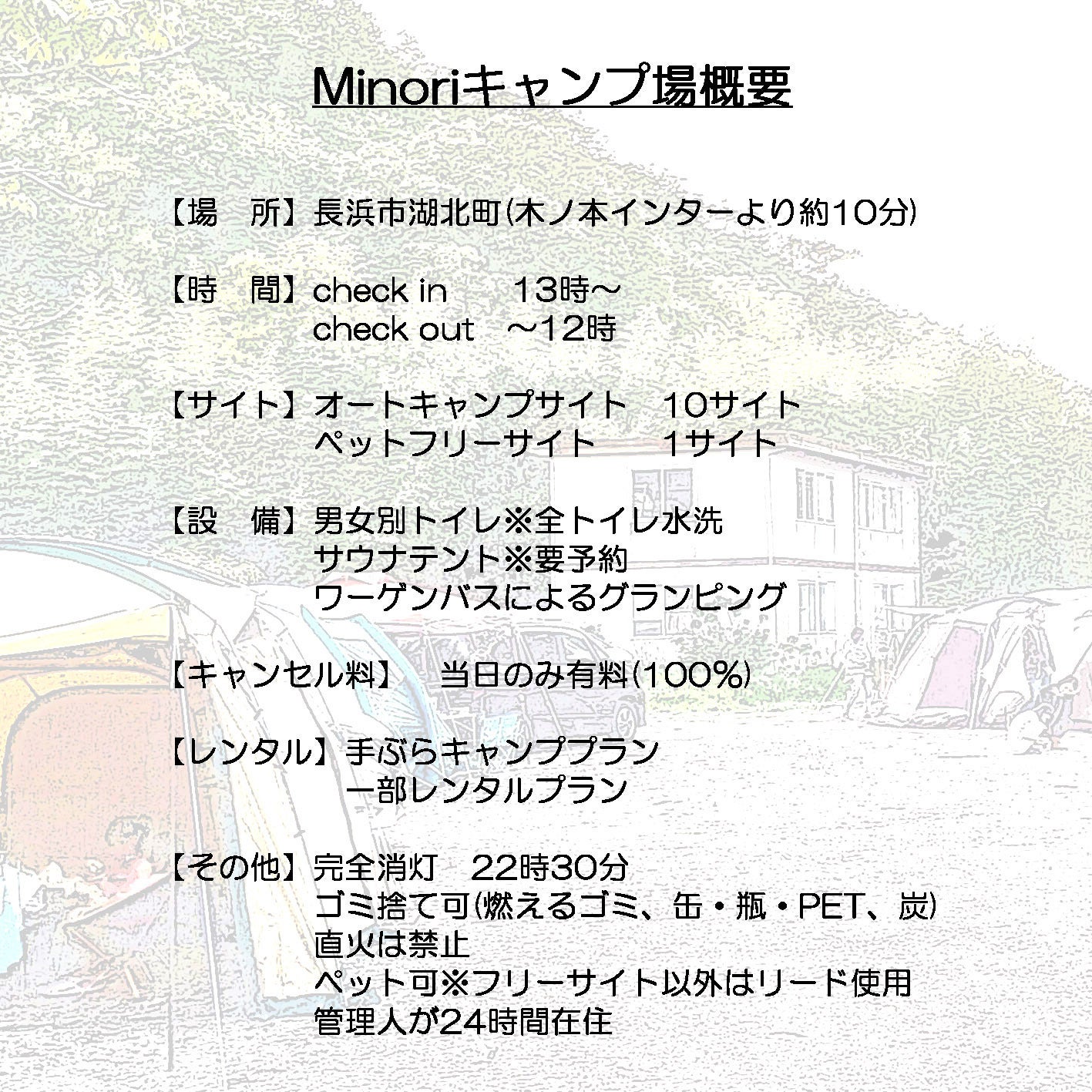 Minoriキャンプ場は滋賀県長浜市にある山本山の麓、住宅地と農地、自然が程よく混じった、静かな場所にあります。