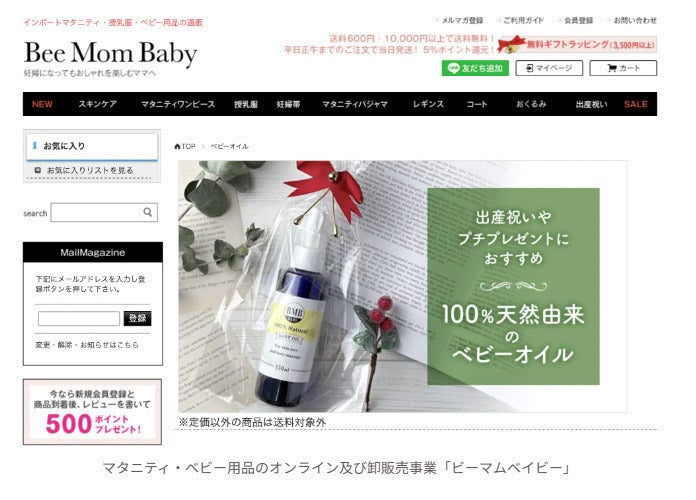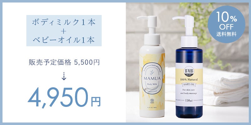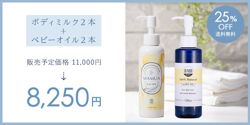 また、MAMUAの姉妹ブランド「ビーマムベイビー」の100%天然由来のベビーオイル単品、ボディミルクとベビーオイルのセットもご用意いたしました。