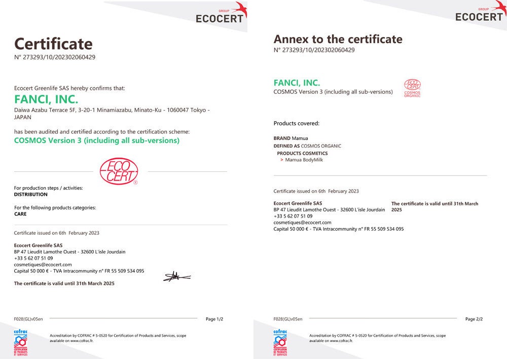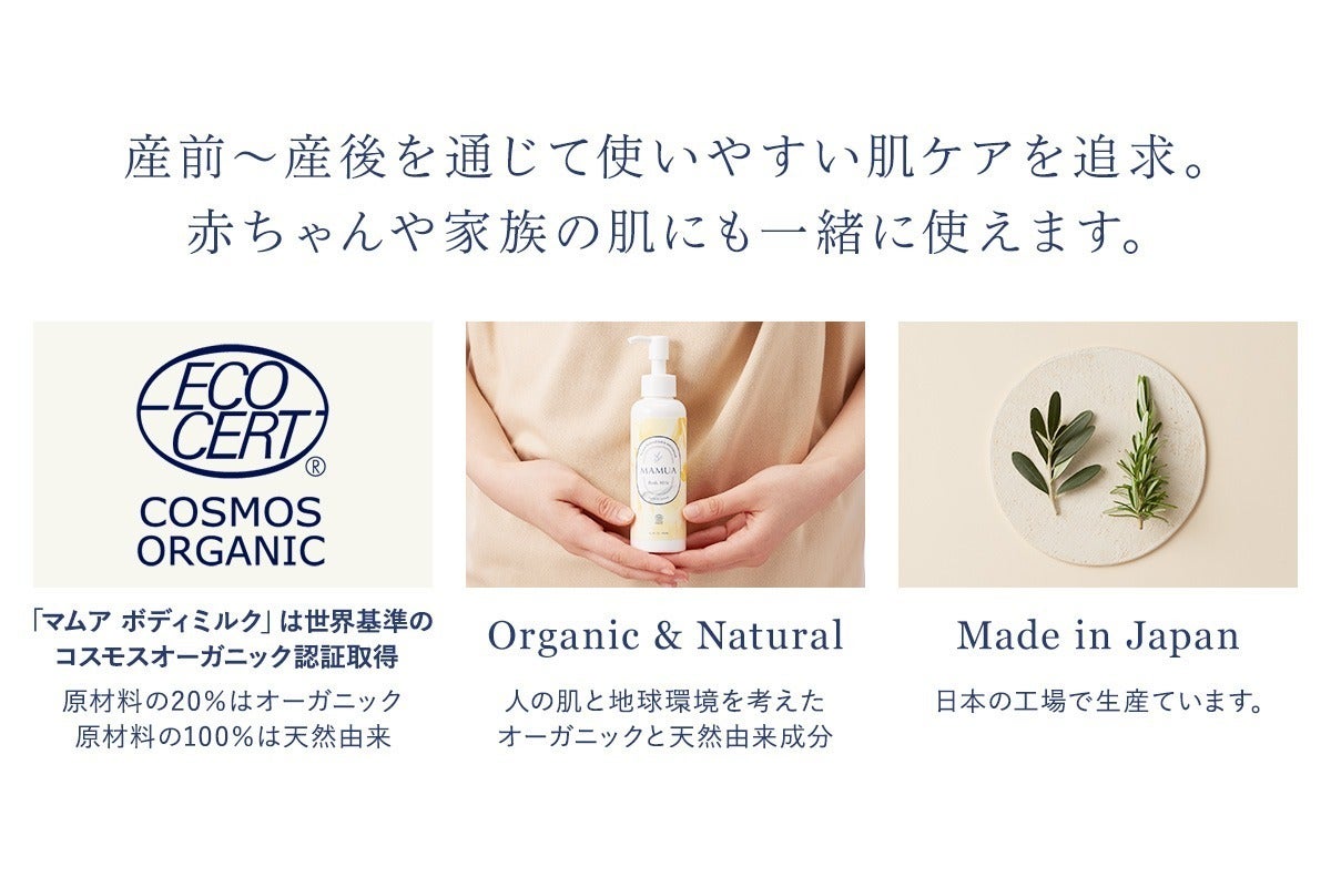 モノに溢れた現代の情報化社会において、より多くの方へ「環境にも優しく身体にも安全」な商品を提供するため、2023年2月に「マムア ボディミルク」は品質の証として、世界最大規模のオーガニック認証団体「ECOCERT(エコサート)」のコスモスオーガニック認証を取得しました。