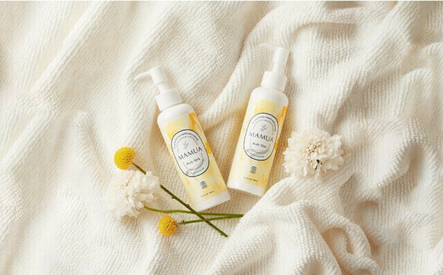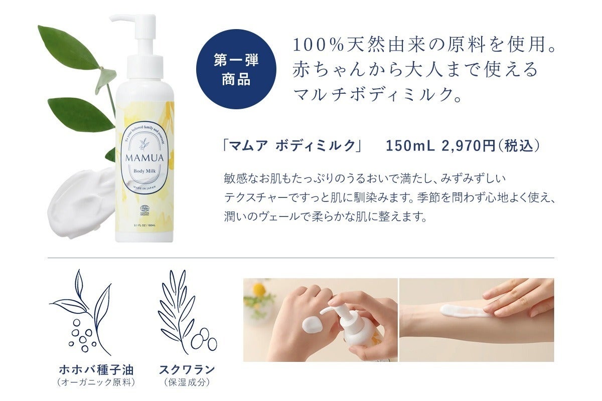 ブランドの第1弾商品は、産前から産後を通じて使いやすい肌ケアを追及、赤ちゃんや家族の肌にも一緒に使えるボディケア商品の「マムア ボディミルク」でした。