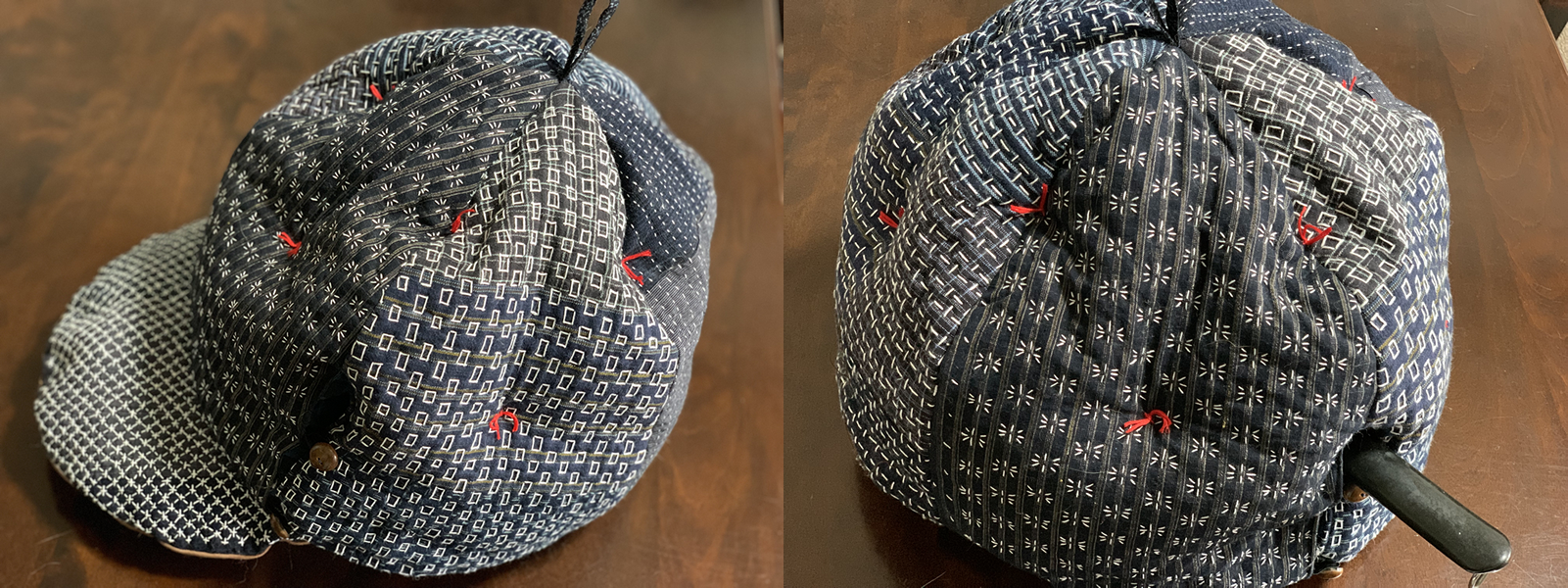 4.藍染生地に刺し子を施したオリジナルデザインのティーコジー