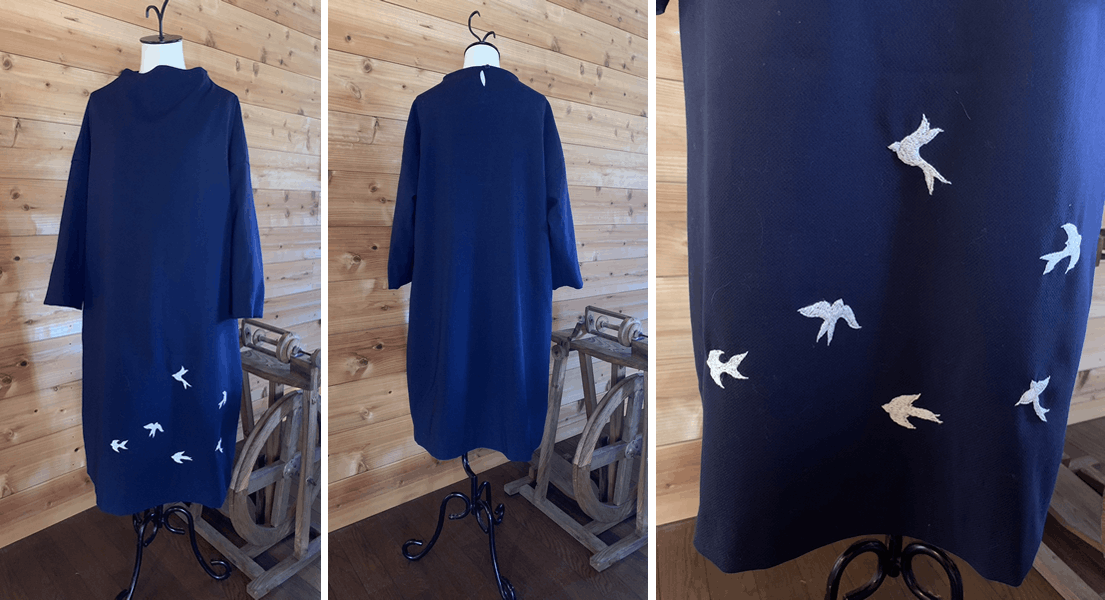 最新作はつばめ柄を刺繍したワンピース(下写真)、フォーマルな場面でもご利用いただける作品です。