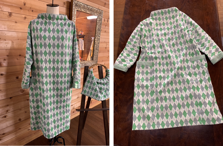 アーガイル柄ワンピース 同柄バッグ付き ポケット口と袖に戻りの縁取りをいれて可愛く