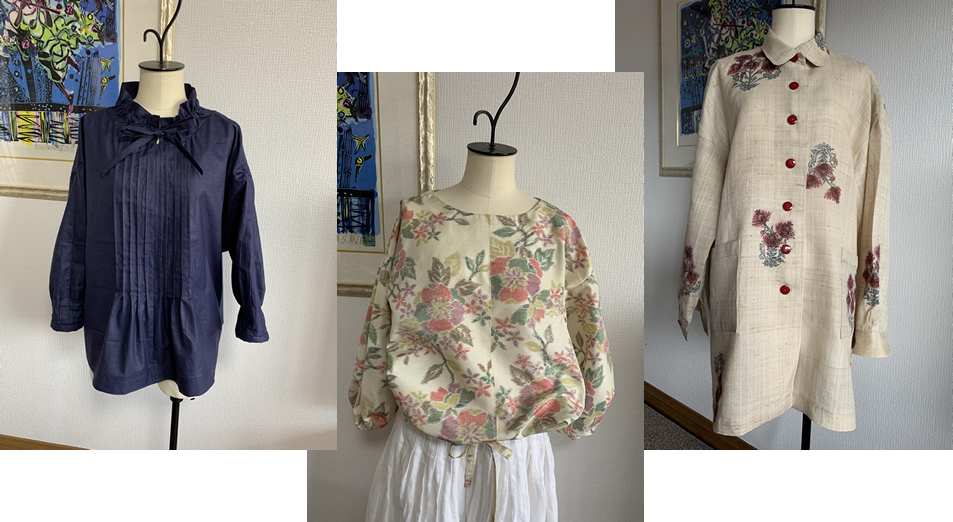左は着物の「八掛」から作ったピンタックブラウス 中央は自身の着物を可愛いブラウスに