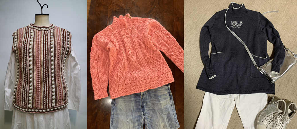 左から ①暖色系アンゴラ糸のベスト ②アラン柄セーター ③シルク・ウール混毛ハイネック