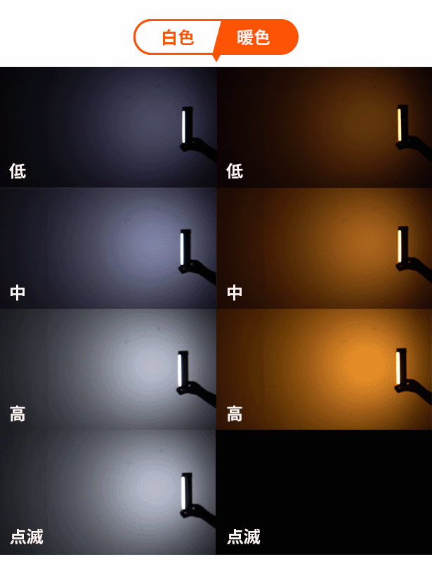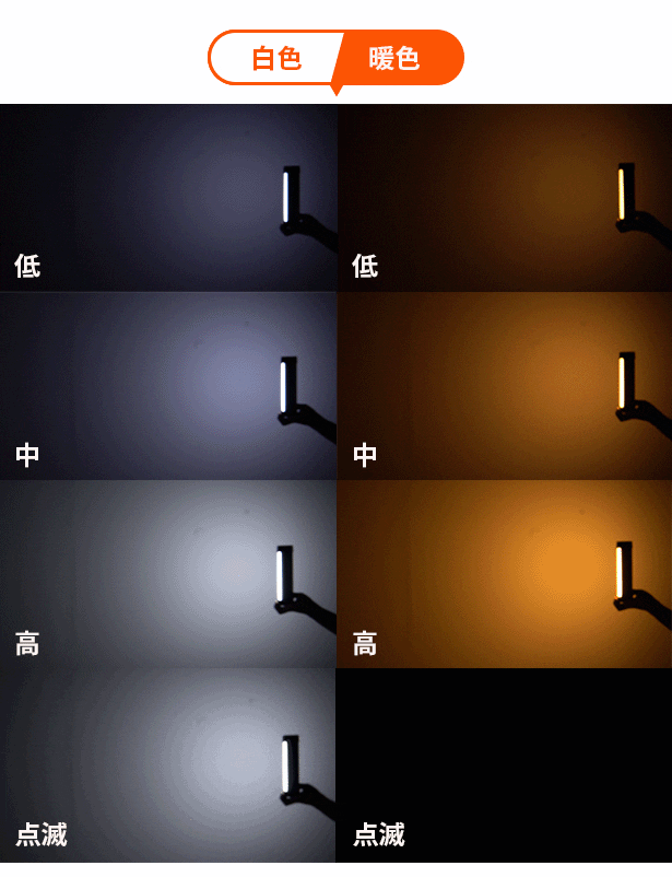 明るさは高、中、低の3段階から調節でき、さらに白色と暖色を選ぶことが可能です。