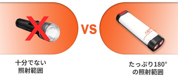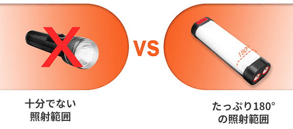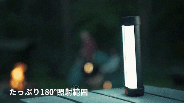 多くのキャンプライトは照射範囲が90°程度のものが多く、真っ暗なテントの中で明るいのは手元だけ…これではちょっと不便な時がありますよね。