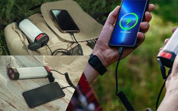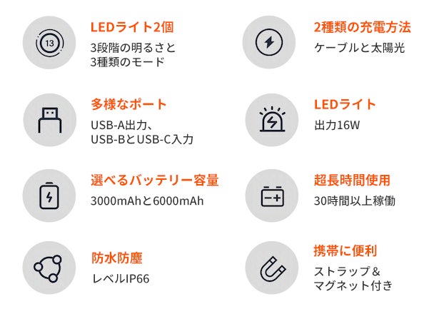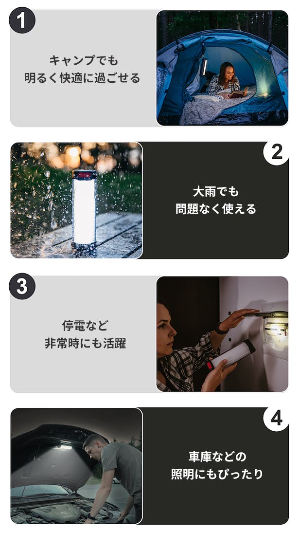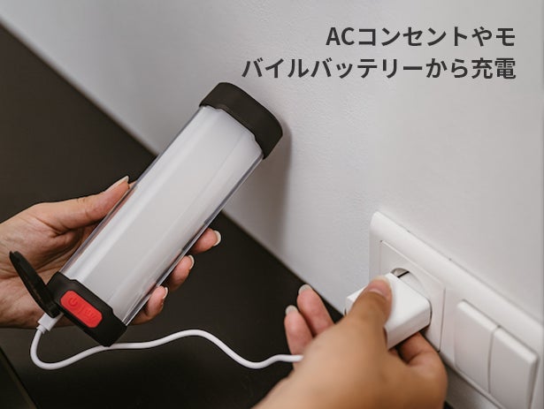 キャンプなどアウトドアの時だけでなく、突然の停電の時にも周囲を明るく照らして行動でき、スマホなどのデバイスを充電することが可能です。
