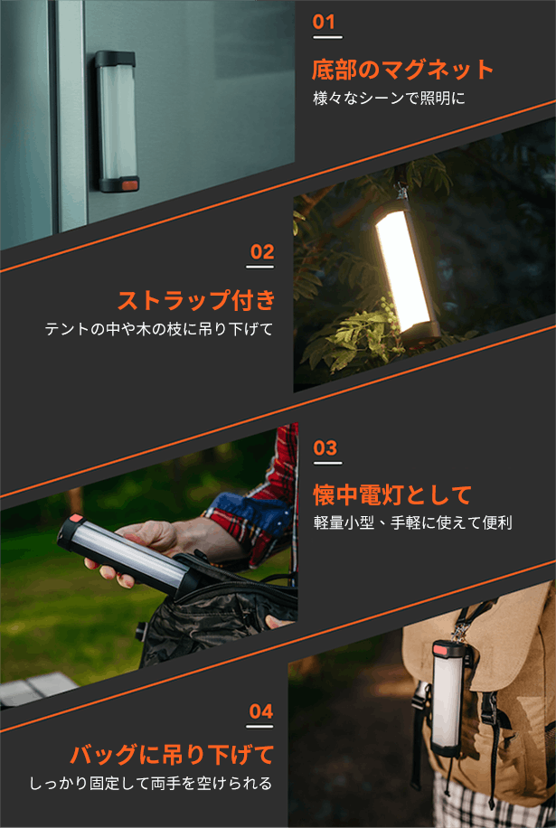 例えば、夜間に突然車が故障した、自宅で仕事中に停電が起こった、そんな時に底部のマグネットでドアや冷蔵庫などに取り付ければ、非常灯として活躍します。