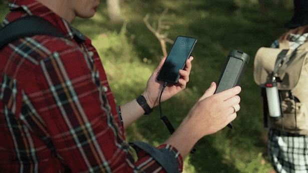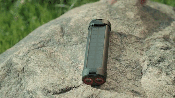 ABFOCEの特徴のひとつは、太陽光パネルを搭載していることです。例えば、登山バッグに下げて太陽光に当てておけば、昼間移動しながら充電することが可能です。