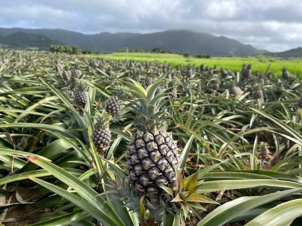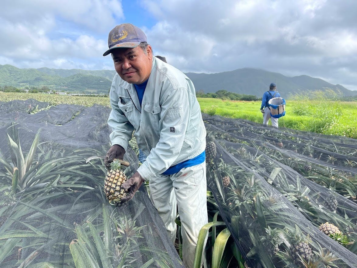 石垣島の中部に4か所農耕地をもち、広大なパイン農園に約20万本の苗木を植えています。品種はピーチパイン・ポコットパイン・島パイン・グランパイン・ゴールドバレル・サンドルチェと多種を栽培。それぞれ1年通じて収穫時期が異なるため計画、工夫、改善を繰り返し生育しています。昨今の気候変動の影響も大きく、一つの農耕地(区画や土壌の状態)毎にきめ細かい生育が必要です。また広大な土地の管理上、資材及び輸送費の高騰が一番大きな負担になっています。