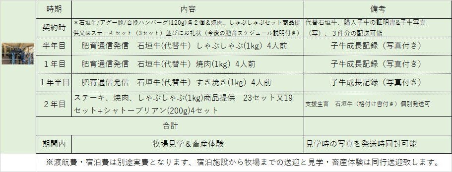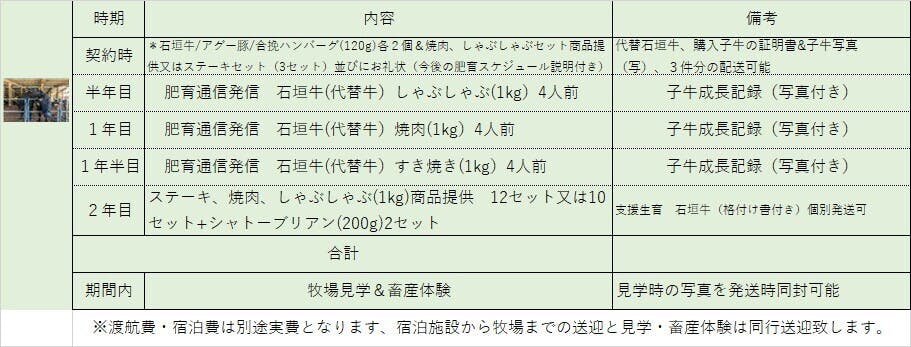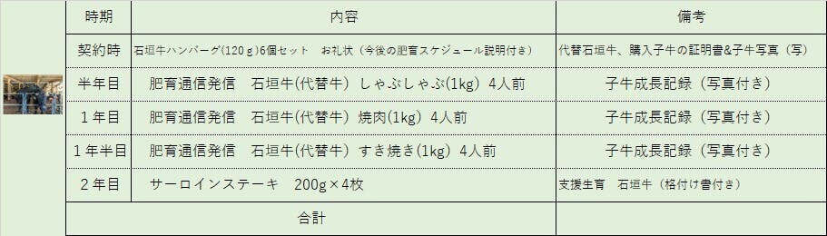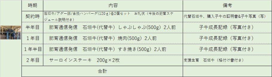 ※④~⑦ 支援契約時に子牛の生育スケジュールとお礼状合わせて商品(代替牛)をお送りさせて頂きます。また、自宅用・贈答用のリストの作成をお願いいたします。その後半年に一度子牛成長記録のご連絡を差し上げます。ご支援・応援頂き生育・肥育を終え加工した精肉を御礼(リターン)させて頂きます。購入子牛の生育・肥育に問題が生じた場合 同時期に購入した牛で対応をさせて頂きます。