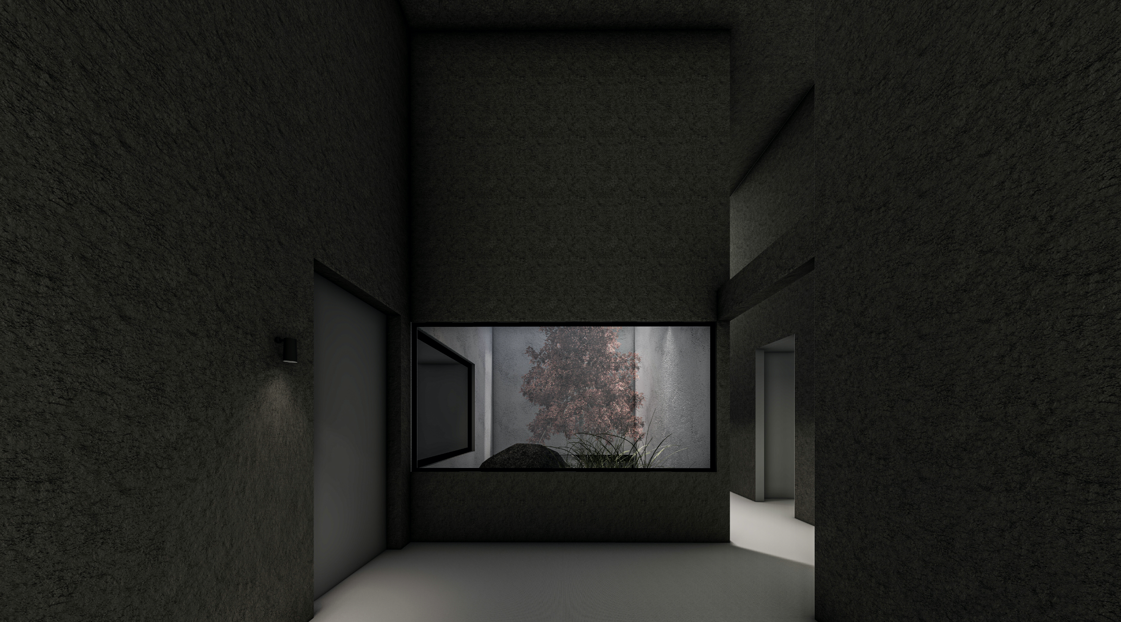 正面の扉を開けると高い吹き抜けと小さな坪庭がお客様を静かにお出迎えし、影と光が非日常を演出します。