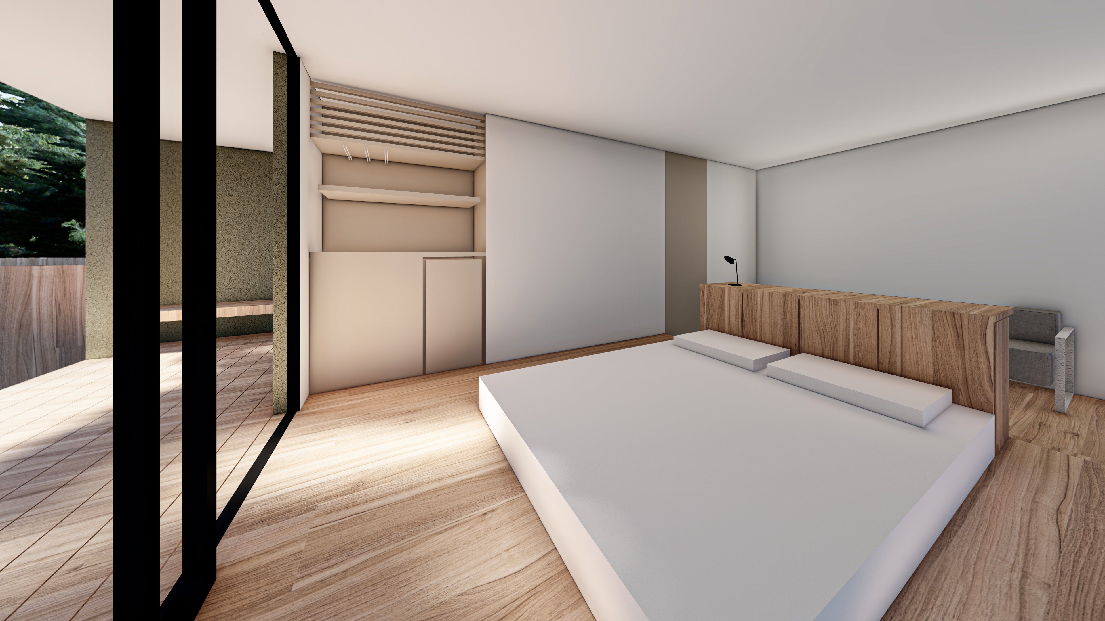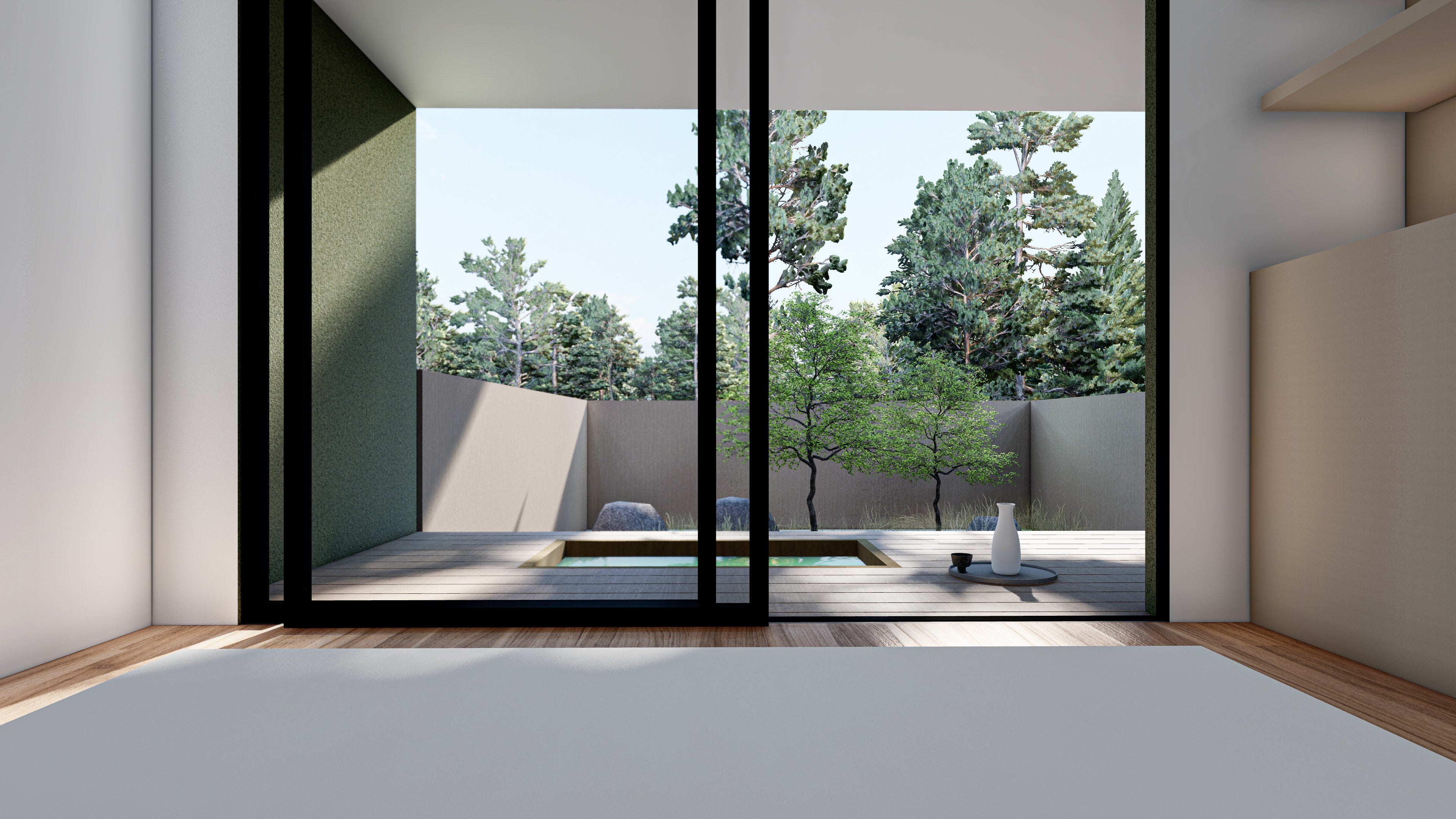 景色を邪魔しない埋め込み式のベッドと浴槽で庭とリビングの一体感を演出した客室です。ミニバーが窓際に併設されているためお酒を飲みながら足湯も楽しめるお部屋となっています。