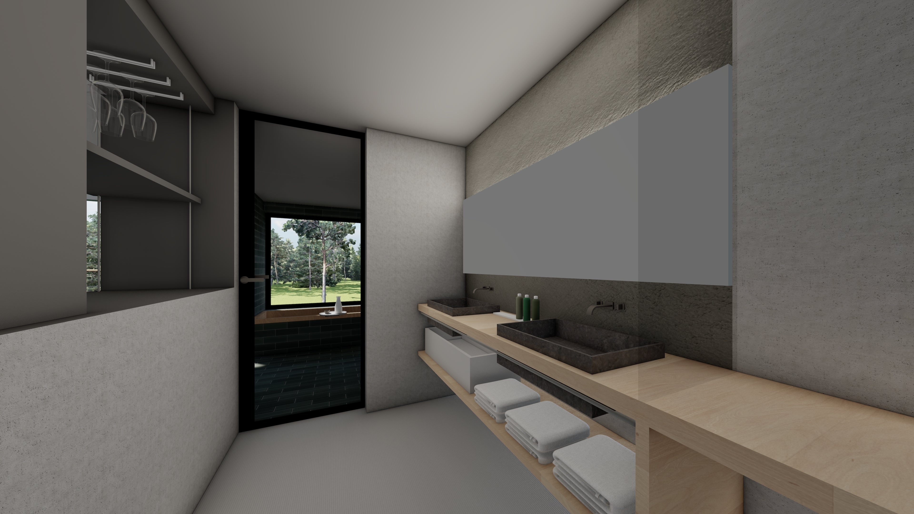 リビングと洗面上の間には大きなアイランドシンク付きミニバーがあります。ミニバーの中にはグラスやマドラーなど自分でお酒を作り楽しむことができるカテラリーなどをご用意しております。