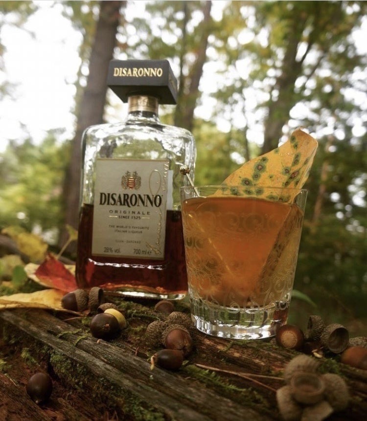 ▲秋をイメージし、柿の葉を添えた山のドングリとアマレットディサローノ(写真提供:宮澤篤)