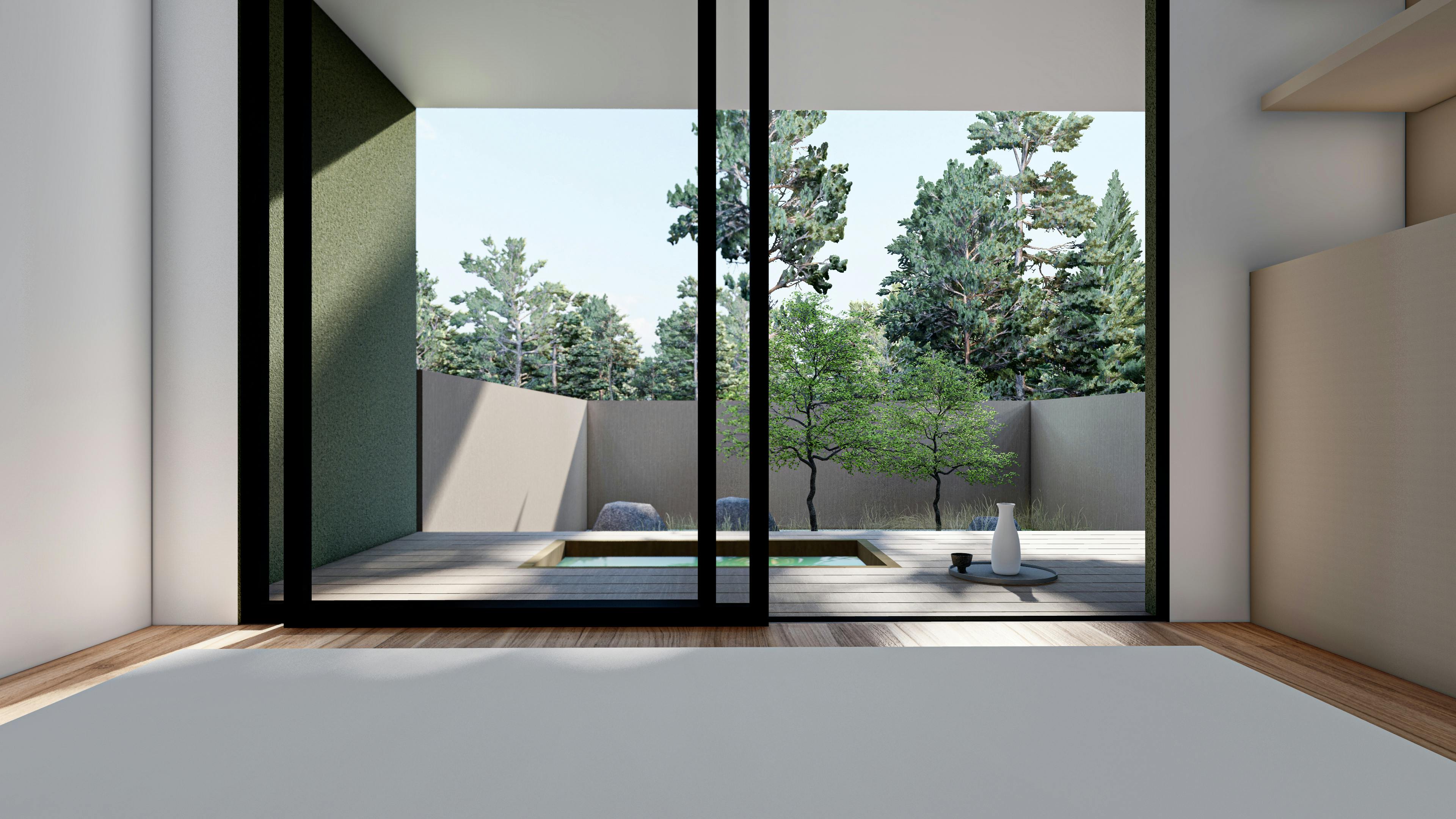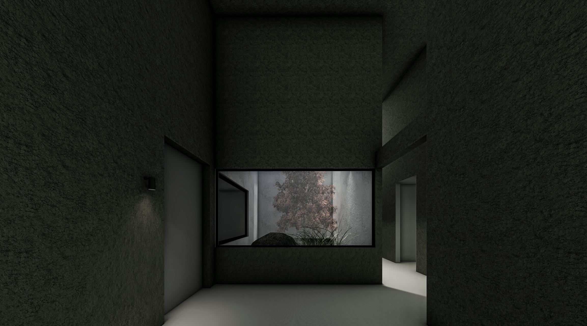 正面の扉を開けると高い吹き抜けと小さな坪庭がお客様を静かにお出迎えし、影と光が非日常を演出します。