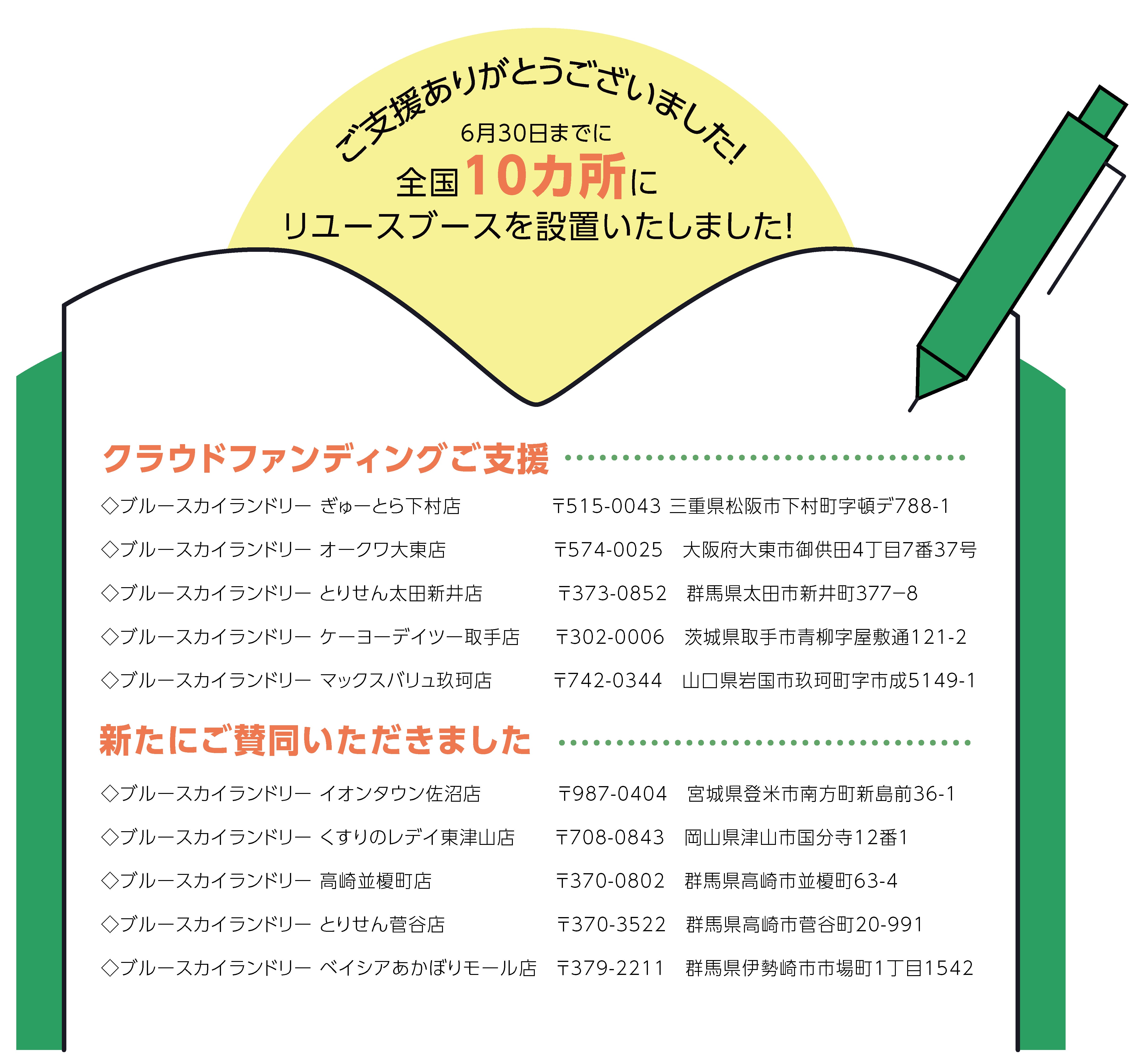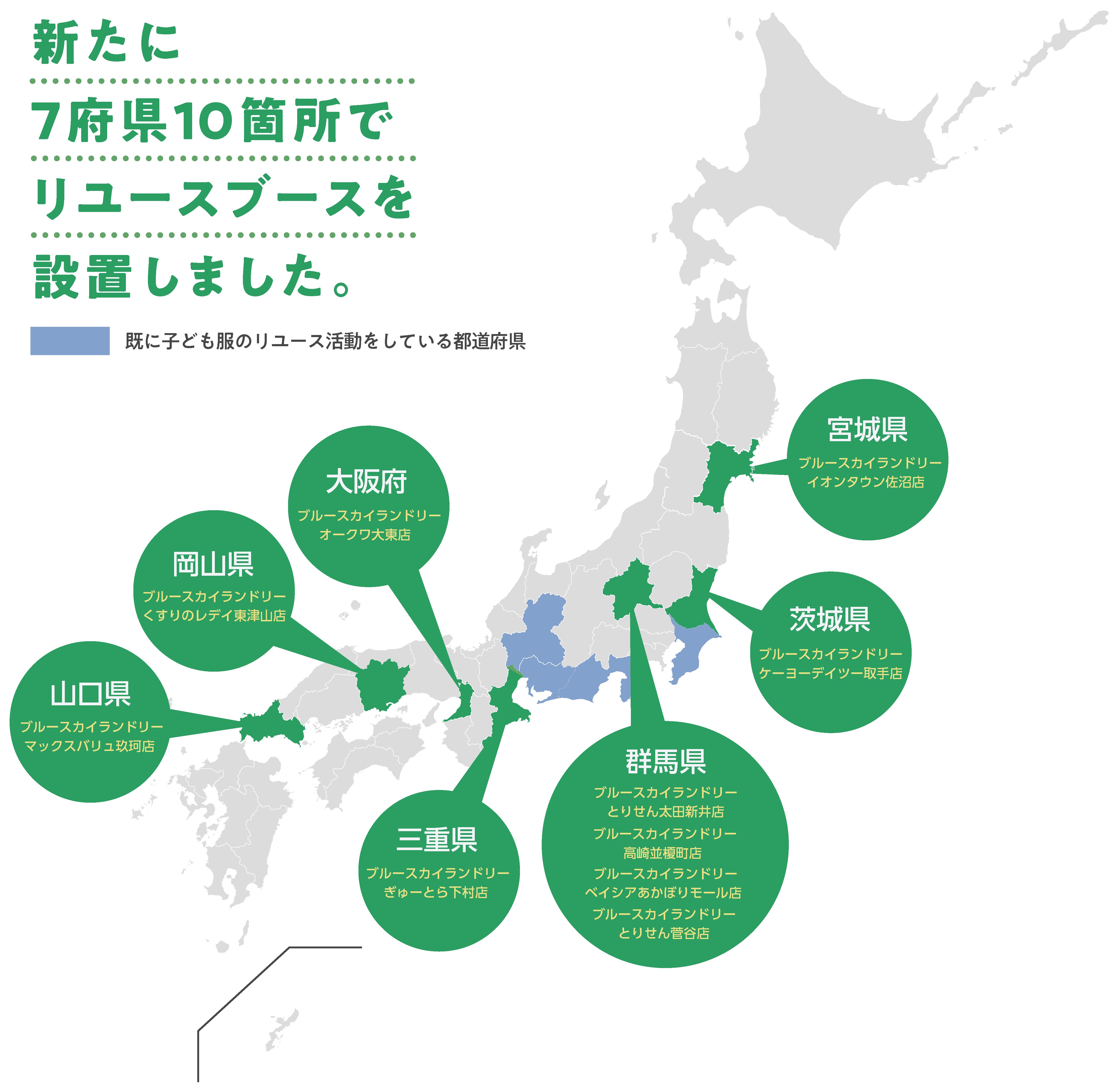 さらに、クラウドファンディング終了後、コインランドリーオーナー様よりご支援・ご賛同をいただき、更に4店舗の拡大が決定し、6月30日をもって全21カ所にて子ども服のリユースブースを設置する運びとなりました。