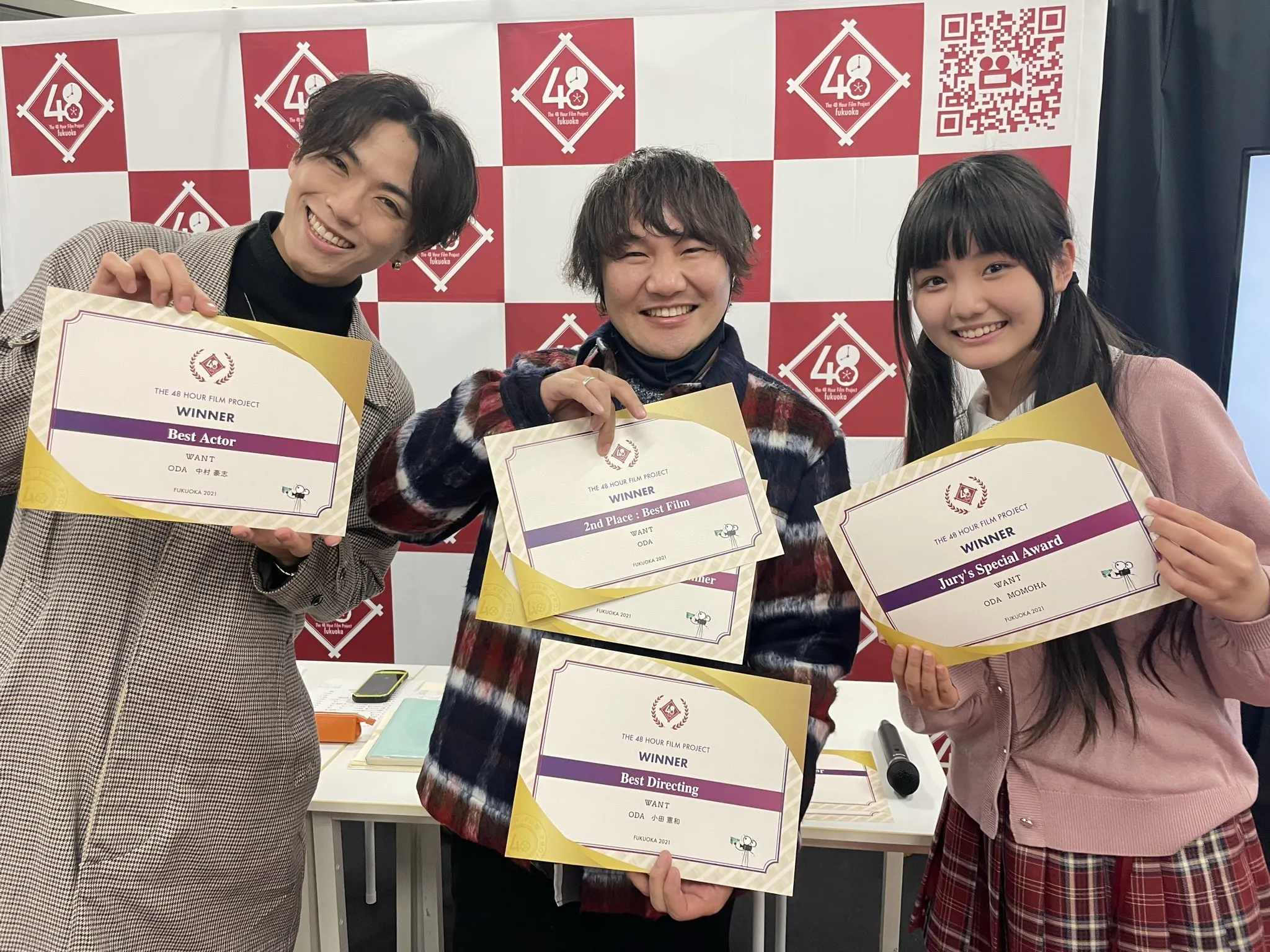 小田監督とは福岡の映像やエンタメを盛上げていきたい! という心意気のもと5年以上の付き合いです。2021年に48HFPの福岡大会が開始するということを聞きこれはやるしかないと参加した2021年大会。 個人的には主演男優賞を頂きましたが 惜しくも作品は準優勝。
