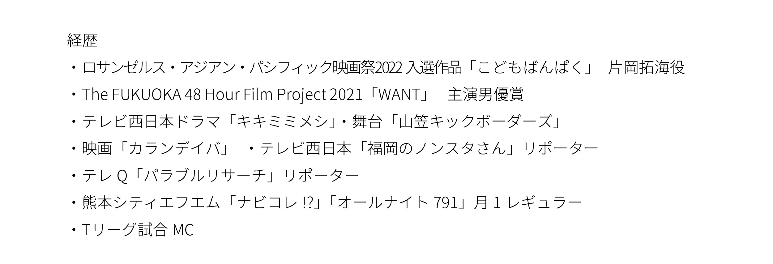 映画のスクリーンの中に創り出される 世界観やキャラクターに憧れて、21歳のとき芸能事務所の門を叩きこの世界に入りました。現在は福岡を九州のエンタメを盛上げたい! という気持ちのもと、九州わちゃわちゃ一座「アンビシャスzero」というグループで活動をしながら 俳優、タレント、MCなど絶賛活動中です!