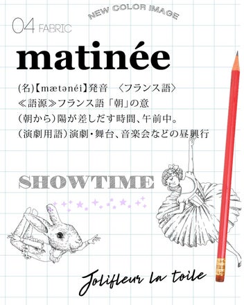 今回の新柄≪SHOWTIME≫ではMatinee(マチネ)というカラーイメージの基に、明るい色味の配色を数パターン作り、先日 染工場様へ試作依頼をお願いしました。来週には、配色の1回目の試作(色の見本)が届くとの連絡がありましたのでご報告させていただきます♪(*´▽`*)