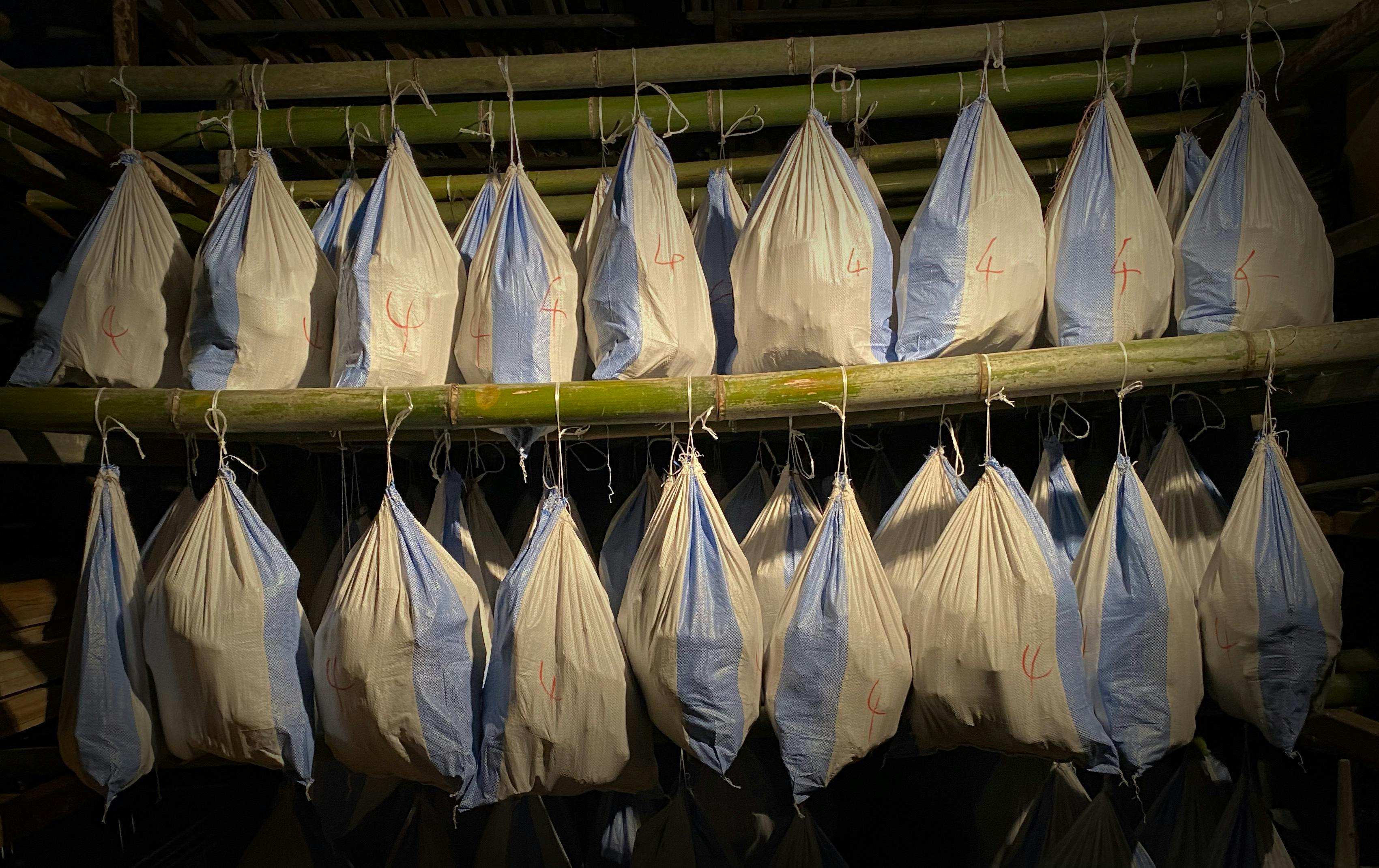 収穫されたさつまいもは標高400mの限られた高地で吊るし熟成させることで、耳納連山から吹き抜ける冷たい風を全身で受け、甘みを引き出し、約3ヶ月後、奇跡とも言える恵まれた環境での寒熟を果たし最高糖度50度にまで達し、とても甘くて美味しいさつまいもが出来上がります。