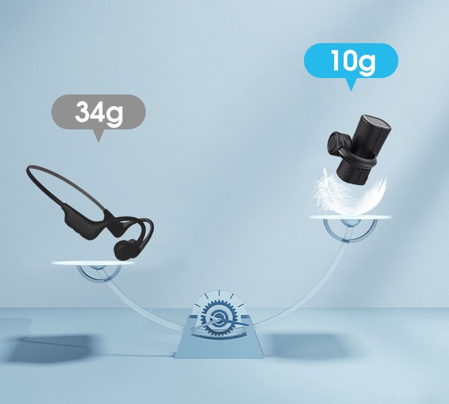 H01の重さはわずか10g、通常の骨伝導イヤホンの約3分の1なので、長時間耳に装着しても重さを感じません。