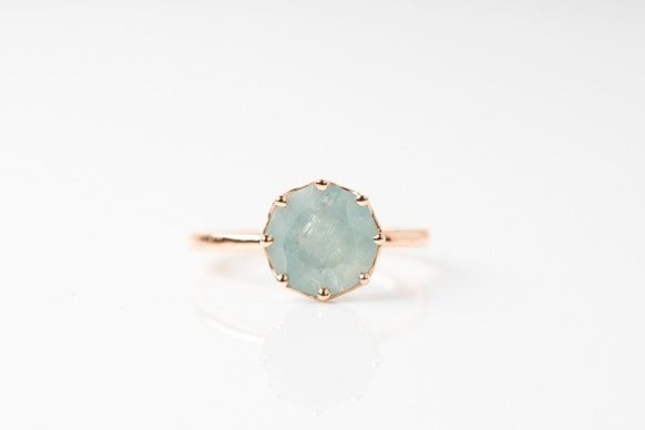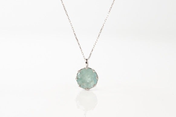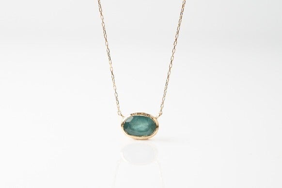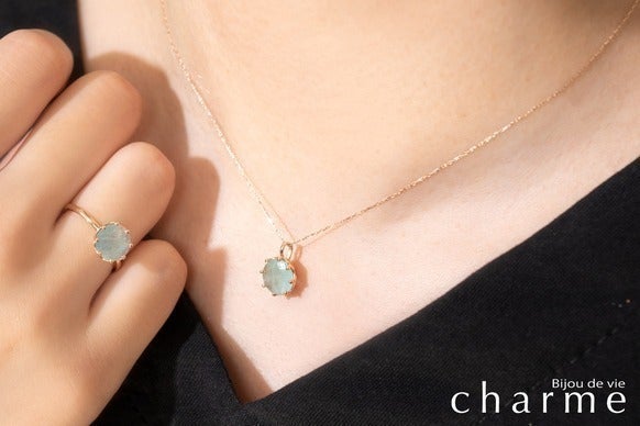 定番のルビーやエメラルドのような、クッキリしたカラーの宝石にはない、クリーミーで上品。優しいブルーグリーンの色合いが、浮くことなく、希少石ならではの個性的な存在感をはなってくれます。