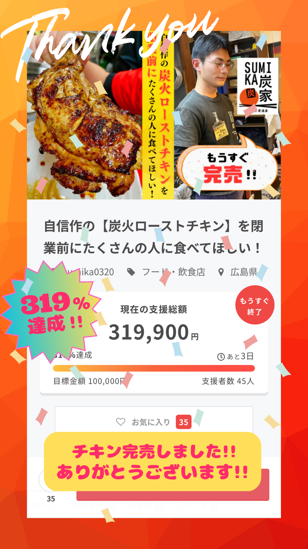 こんにちは、やきとり炭家 店主の松浦です。本日までに45名の方にリターンをご購入いただき、嬉しいことにローストチキンが完売いたしました!本当にありがとうございます!!目標額も300%達成という非常に嬉しい結果となり、プロジェクト自体はあと3日残っているのですが大きな達成感で満ちております。そして店頭販売や家族だけでは販売に苦戦していた自家製米『ななえびす』もご購入いただくことができ嬉しい限りです。閉店も迫っていることもありクラファン自体やめようかと考えたのですが挑戦してみて本当に良かったです。出品しているお米や『頑張れ店長!!コース』はまだご購入いただけますが、メインのリターンであるローストチキンは完売御礼となり、またチキンが冷蔵庫から溢れ出しそうになってるので順々に発送に取り掛かろうと思います!ミスや不手際なく皆様にお届けできますよう最後まで気を抜かずやっていきますので到着をお待ちください^^お店の営業も残すところあと10日となりました。本日お店はお休みですがチキンの仕込みや発送準備など頑張っていきます!