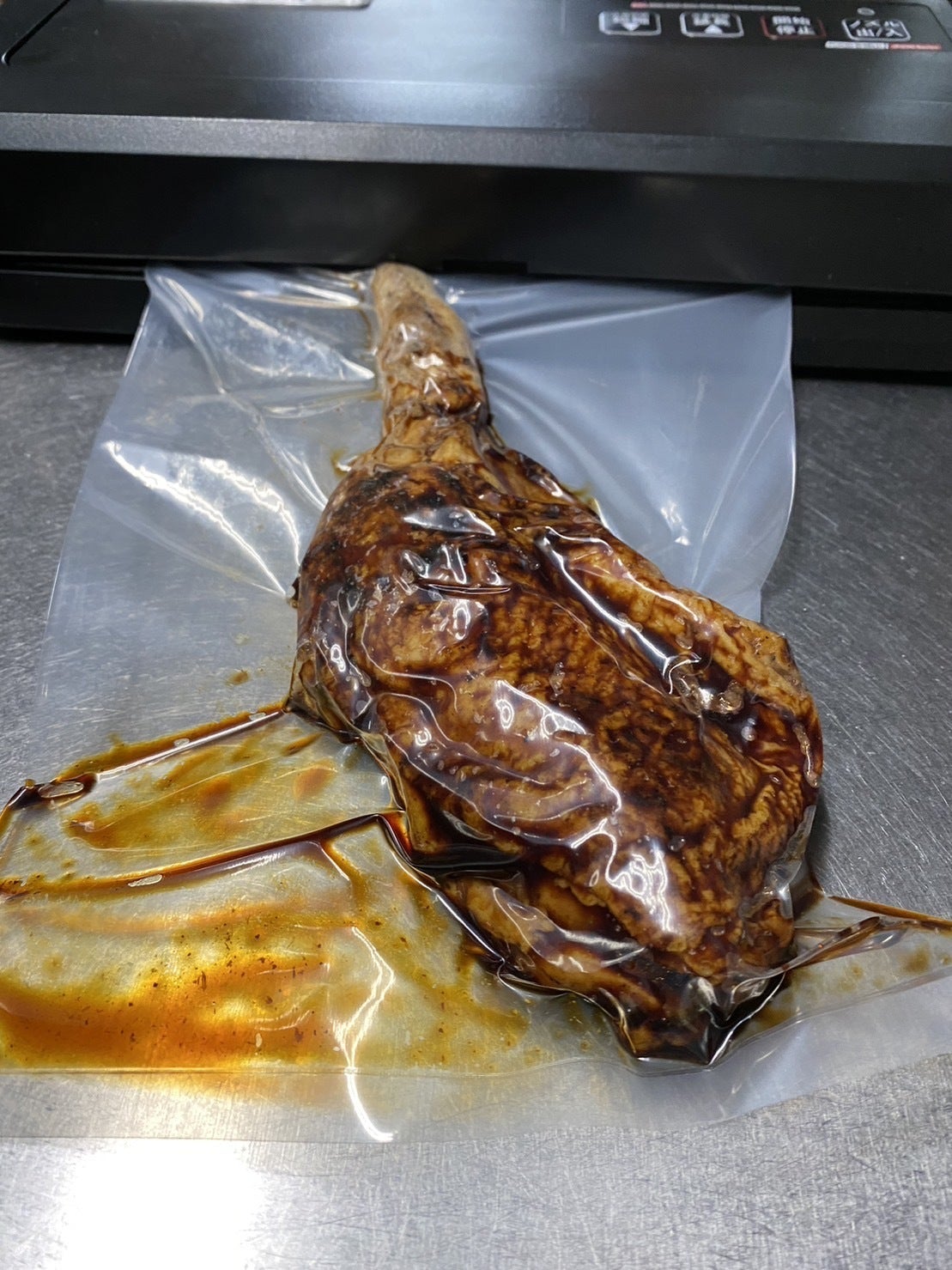 真空包装する際にタレを多めに入れることでパックの中でもタレがしっかりとお肉に浸透します。