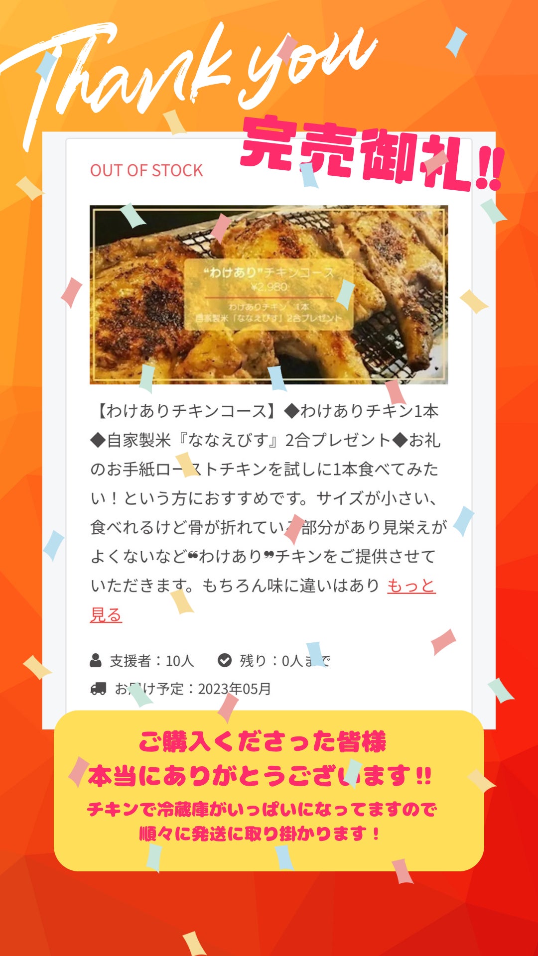 出品しているお米や『頑張れ店長!!コース』はまだご購入いただけますが、メインのリターンであるローストチキンは完売御礼となり、またチキンが冷蔵庫から溢れ出しそうになってるので順々に発送に取り掛かろうと思います!